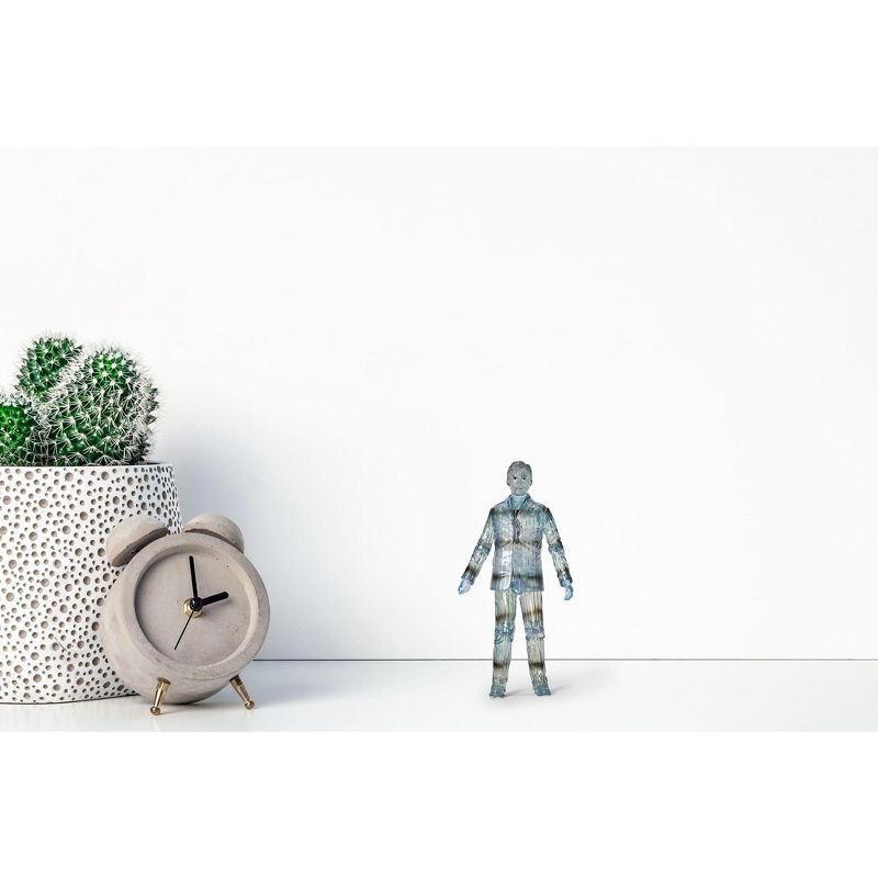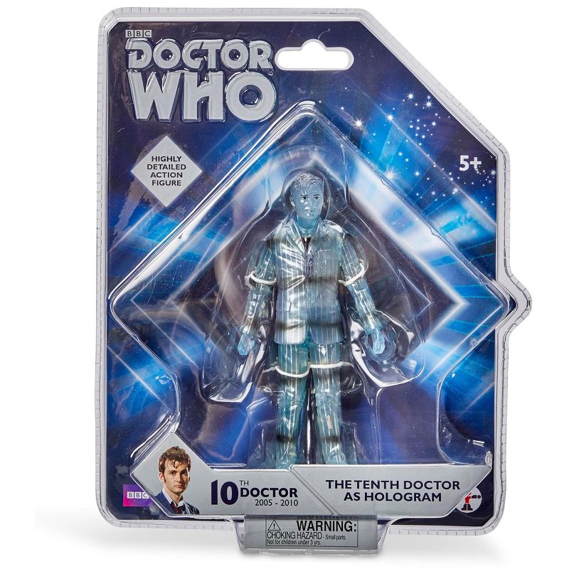 The Doctor has appeared as a projected hologram via the TARDIS interface on a few occasions, most often in an emergency situation to project himself into somewhere he cannot physically travel or in his place when indisposed. Here the Tenth Doctor is seen as TARDIS Security Protocol 712, a holographic projection from the episode "Blink" when he appeared to Sally Sparrow and Larry Nightingale while they were under attack by the Weeping Angels. The Doctor Who Tenth Doctor Hologram action figure measures approximately 5-inches tall.