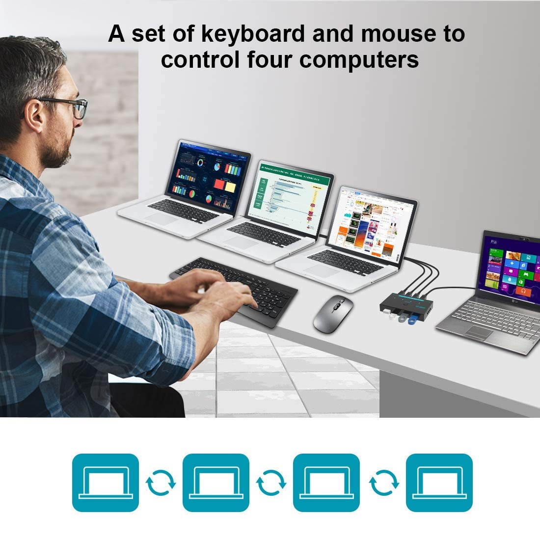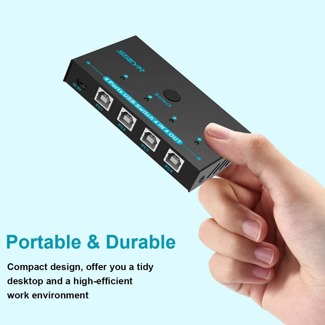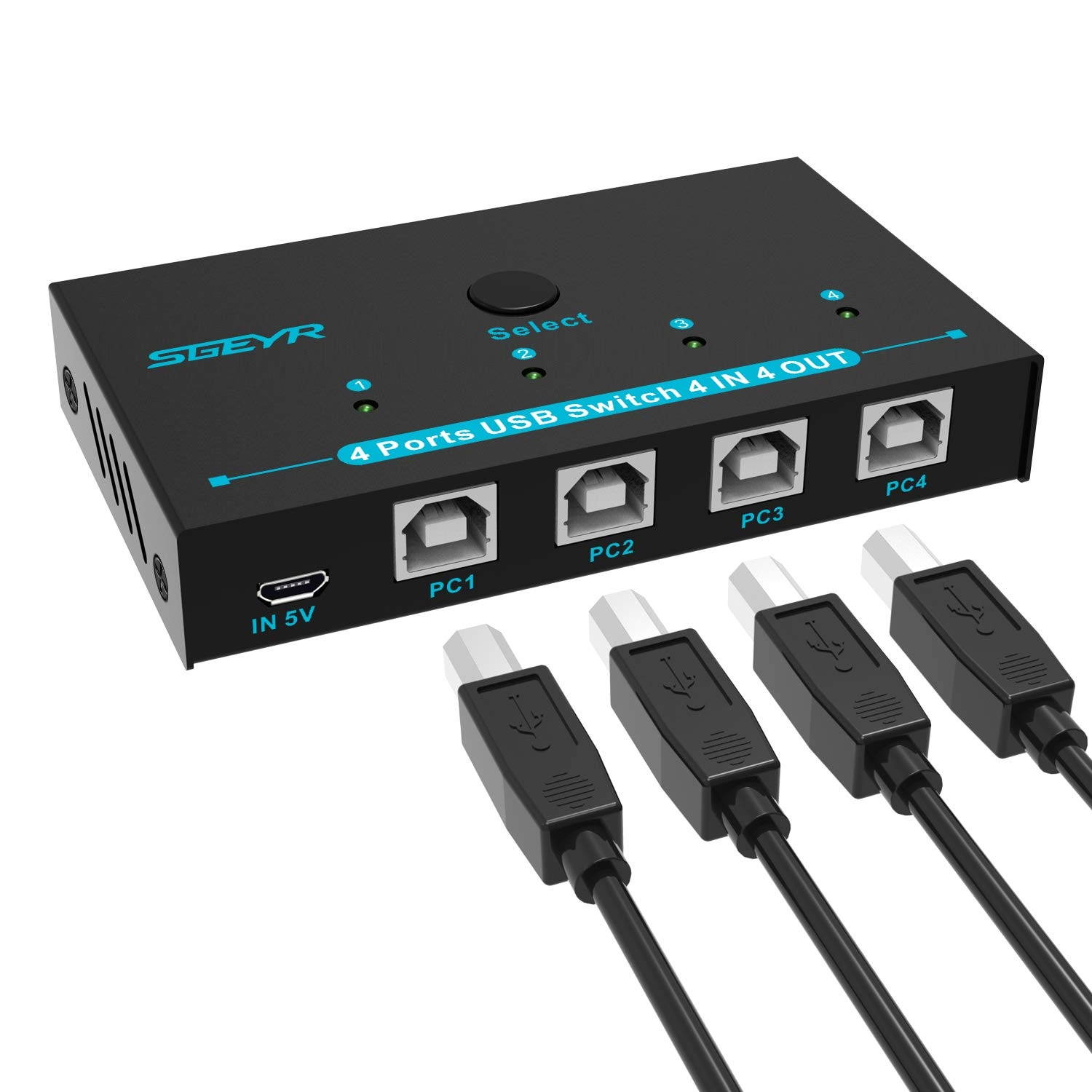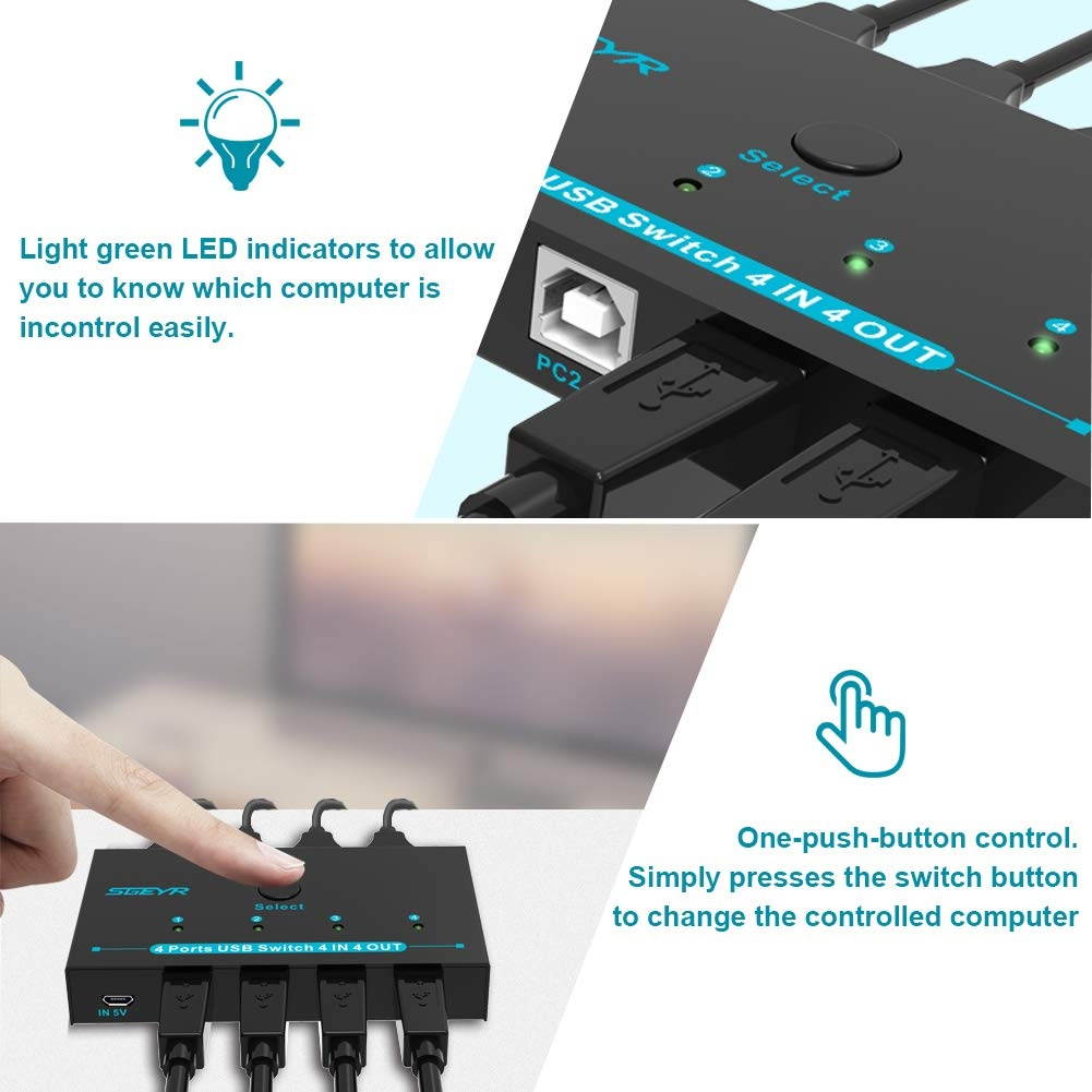 ??USB 2.0 Sharing 4 Computers??SGEYR Metal Mini usb cable switch selector is functioning as a 4 Port USB 2.0 USB Sharing Switcher allows one button swapping between 4 computers to share 4 USB 2.0 peripheral devices??Easy to use-Driver-Free??USB 2.0 Sharing Switch is so easy to set up and no need any driver. USB sharing switcher works great sharing keyboards, mice, and portable storage between Four PCs. ??Button and LED indicate lights?? perfect mini button design easy to switch between 4 computers by a single click on the button with LED indicating the active computer. ??Compatible System?? 4 port usb switch works flawlessly with Windows 10/8/ 8.1 /7/XP, MacOS, and Ubuntu Linux.
