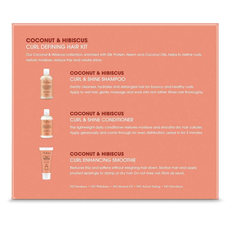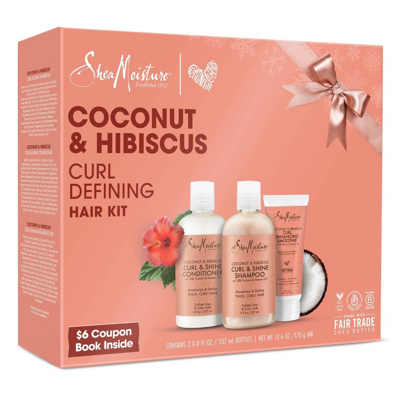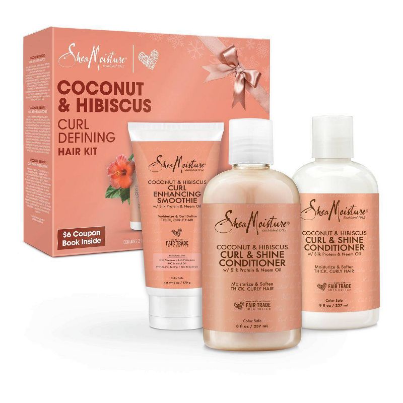 •SheaMoisture Coconut & Hibiscus Curl Defining Hair Kit includes Curl & Shine Shampoo - 8oz., Curl & Shine Conditioner - 8oz., and Curl Enhancing Smoothie - 6oz., making it the perfect gift for her.