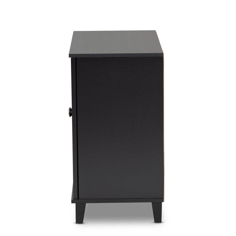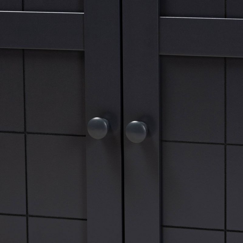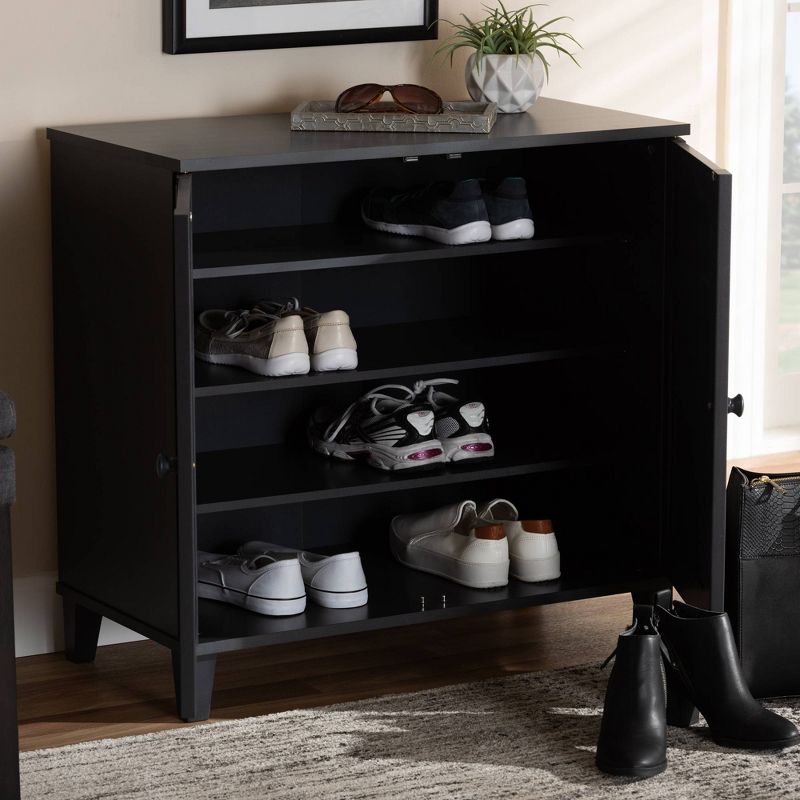 Featuring a classic design and ample storage space, the Glidden shoe cabinet is a stylish option to keep your entryway organized. Two doors conceal four fixed shelves with space to store multiple pairs of adult and childrenÕs shoes. The doors showcase a recessed grid pattern, adding a sense of visual depth to your space. Tapered legs add refined style and provide elevation to deter dust buildup. Constructed from engineered wood, the Glidden showcases a sleek dark gray finish that complements any color scheme. The Glidden shoe cabinet is made in Malaysia and requires assembly. Dimensions: 28" High x 29.5" Wide x 15" Deep; Shelves: 5.1" High x 27.6" Wide x 11" Deep; Legs: 3.5" High