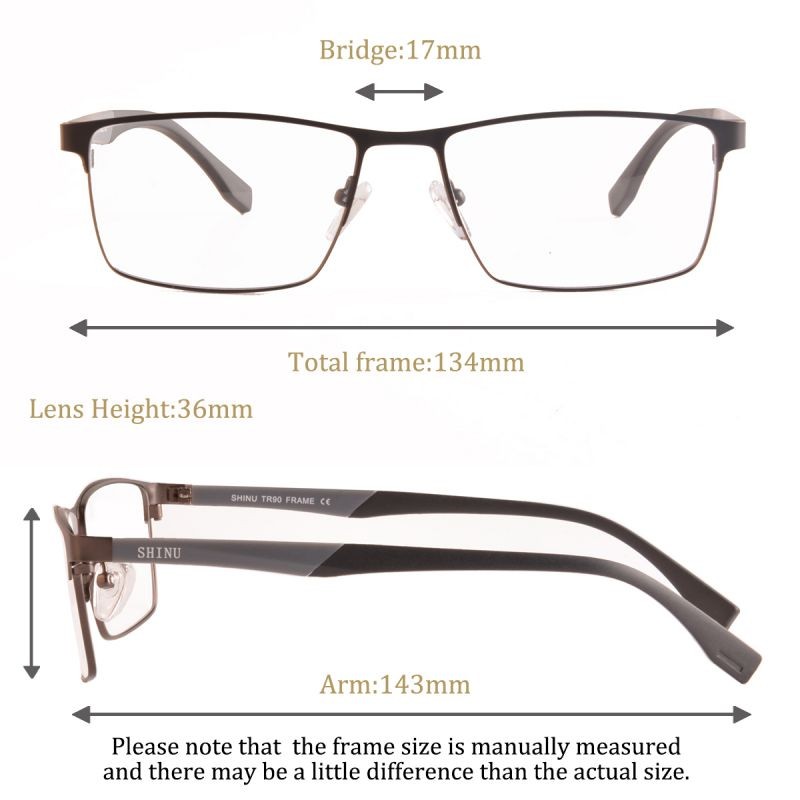The Dimension: frame (134*36mm) lens (53*34mm) bridge (17mm) arm (143mm) SHINU Transparent anti-blue lens. More than 20% blue light blocking rate, exceeding the market standard for anti-Blu-ray lenses. At the same time, near-perfect light transmission keeps your sight from being affected as much as possible. PACKAGE INCLUDED 1*glasses 1*fiber cloth 1*fiber pouch 1*Thank you card