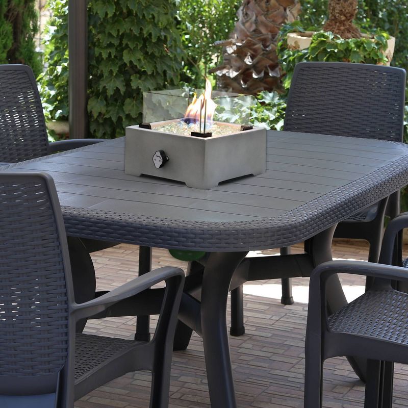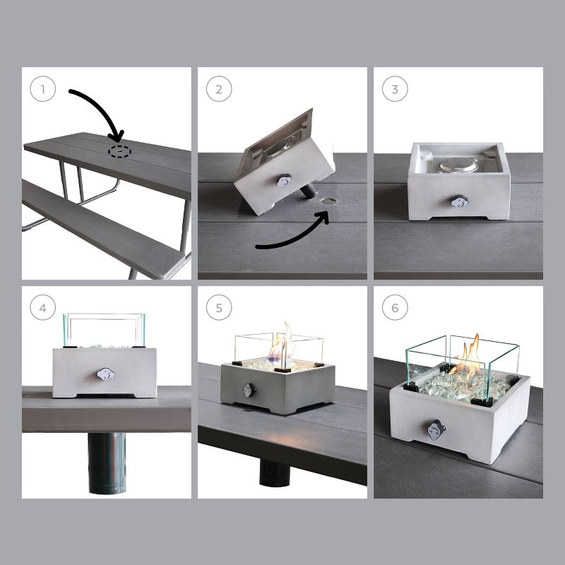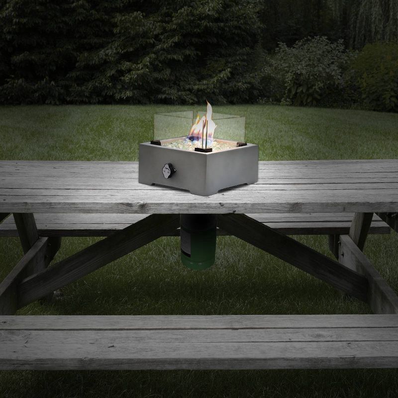 This beautiful square concrete Tabletop Fire Pit is a charming addition to your outdoor living area. Requires an outdoor table with an umbrella hole, insert the fire pit to conceal the umbrella hole on your patio table with an alluring dancing flame. This elegant square Tabletop Fire Pit requires a 1lb propane tank (not included) which hides neatly underneath the table. Bring elegance, functionality and warmth to your patio table for tranquil summer nights or chilly fall evenings. This small fire pits emits 10,000 BTU and includes clear flame glass and protective wind glass. Dinner with family and friends has never been cozier.
