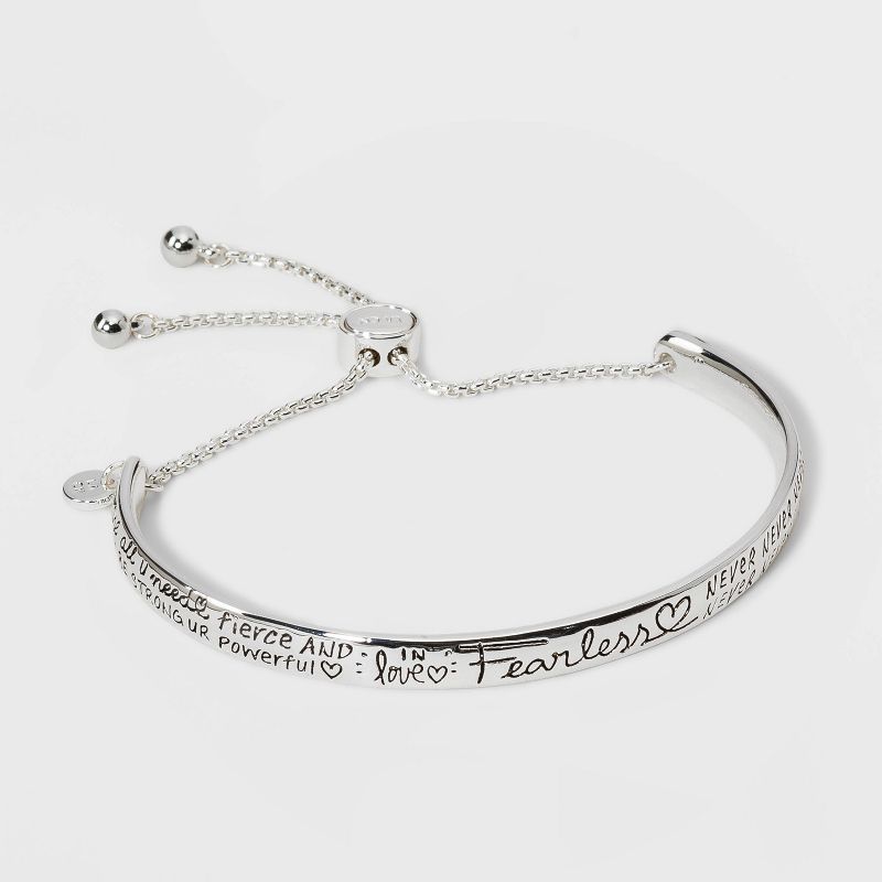 The Silver-Plated "Fearless" Graffiti Design Adjustable Bolo Bracelet will always encourage you be brave and bold in the face of any challenges. This silver-finish adjustable bracelet features a sleek, c-shaped band inscribed with "Fearless" and other related, encouraging phrases scribbled across in handwritten, graffiti-like style for a unique look. This bolo bracelet is designed with a slide bead that holds together the two ends of the chain, which can slide up and down to release or restrict the amount of chain available for a customized fit every time. You can wear this bracelet alone to accent your outfit, or stacked together with other thin bracelets to remind you to be brave and bold and believe in your dreams.