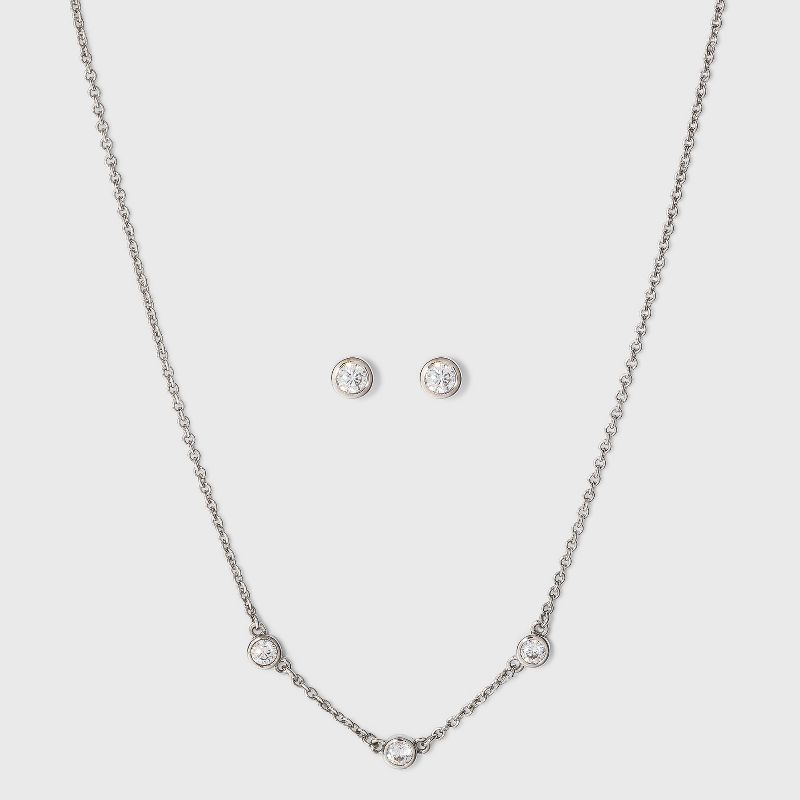 From formal attire to off-duty outfits to work ensembles, add the perfect finishing touch to your look when you add this Cubic Zirconia Stationed Necklace, Earring and Bracelet Set from A New Dayâ„¢. This set features a silver-plated necklace stationed with cubic zirconia accents to add a touch of dazzle and sparkle to your outfit, along with a pair of stud earrings and bracelet for a complete look. The pieces in this set can be worn together for a cohesive look, or paired with other silver-plated accessories for a statement look.