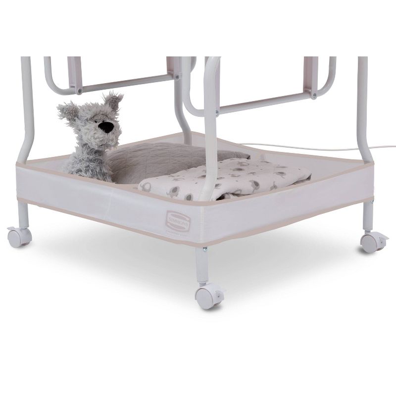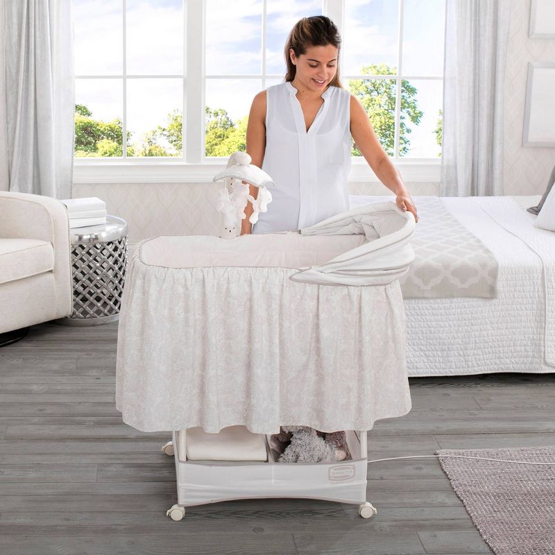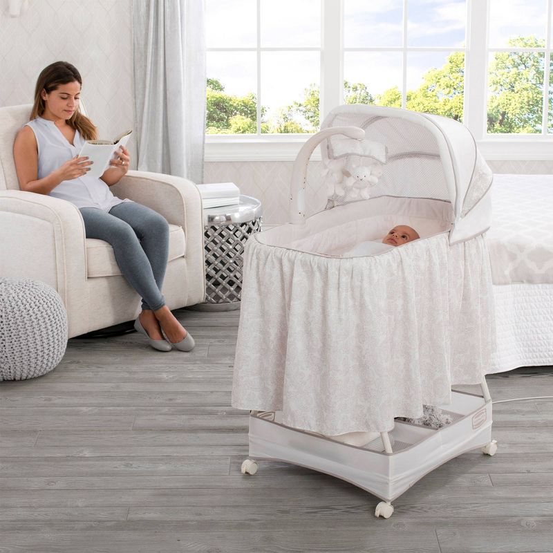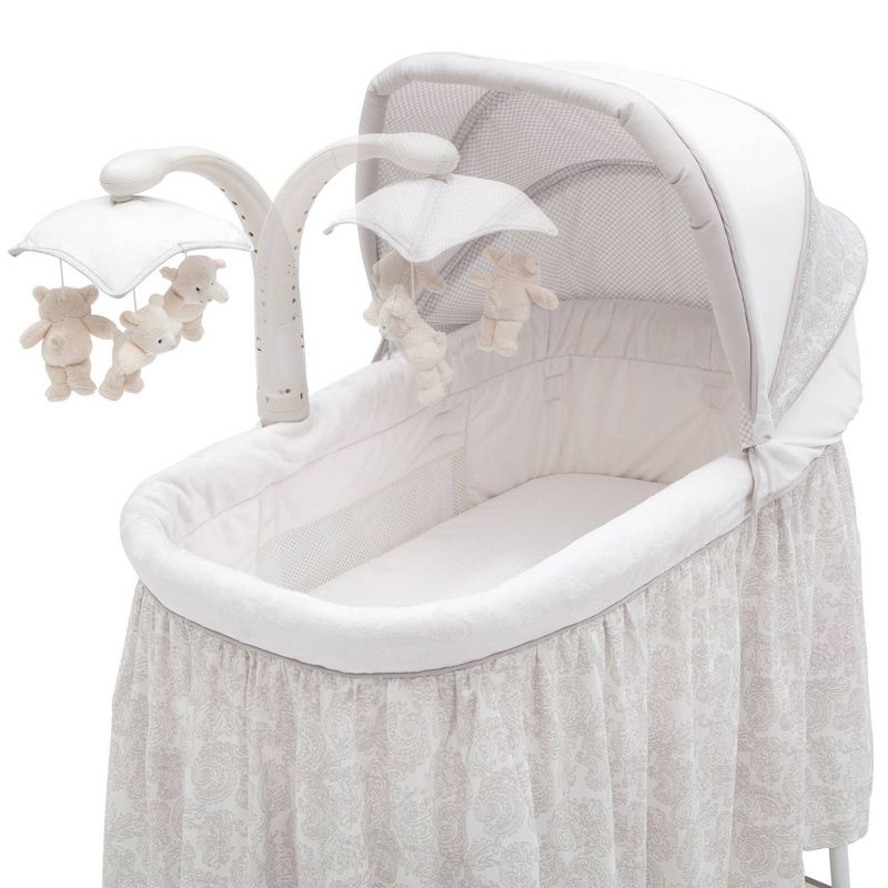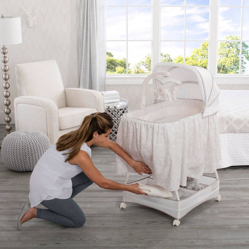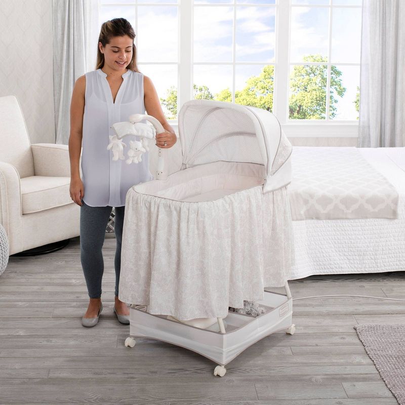 Lull your baby to sleep with the relaxing, automatic gliding movement of the Simmons Kids Silent Auto Gliding Deluxe Bassinet. With a push of a button, the bassinet’s whisper-quiet gliding motion is activated, and the smooth sway of the bassinet will help your newborn drift to sleep peacefully. Outfitted with other electronic features that’ll help Baby power down, this bassinet comes outfitted with preloaded lullabies and sounds, as well as a nightlight—it has everything you need to effortlessly tackle bedtime with your newborn. Built with locking wheels and a lightweight frame to make it easy to move from room to room, this bassinet ensures your little one will have a safe spot to rest in any room of the house—it’s ideal for bedtime or daytime naps, since the adjustable canopy allows you to block light in order to create a serene sleep space anywhere and anytime. This bassinet is recommended for babies 0-5 months. Stop use at 5 months or once your infant begins to push up on their hands and knees, whichever comes first.