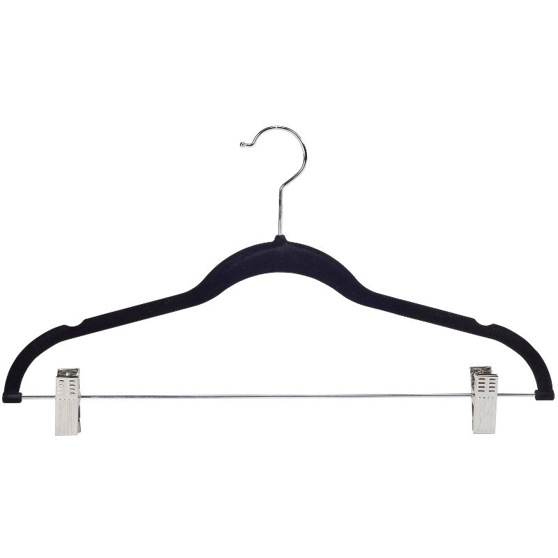 This velvet hanger is an elegant way to create both stylish and functional clothing storage. Beautiful, soft and durable, this velvet suit hanger is contoured to keep suits, shirts, dresses and jackets wrinkle-free. This 6-pack of anti-slip hangers features a velvet coating that is gentle on delicate garments to prevent damage. The velvet coating also provides a non-slip surface that holds fabrics in place. This hanger features durable construction that provides strength and reliability, providing you lasting use. Slim design optimizes closet space. Comes with clips to keep clothes from falling from hangers.