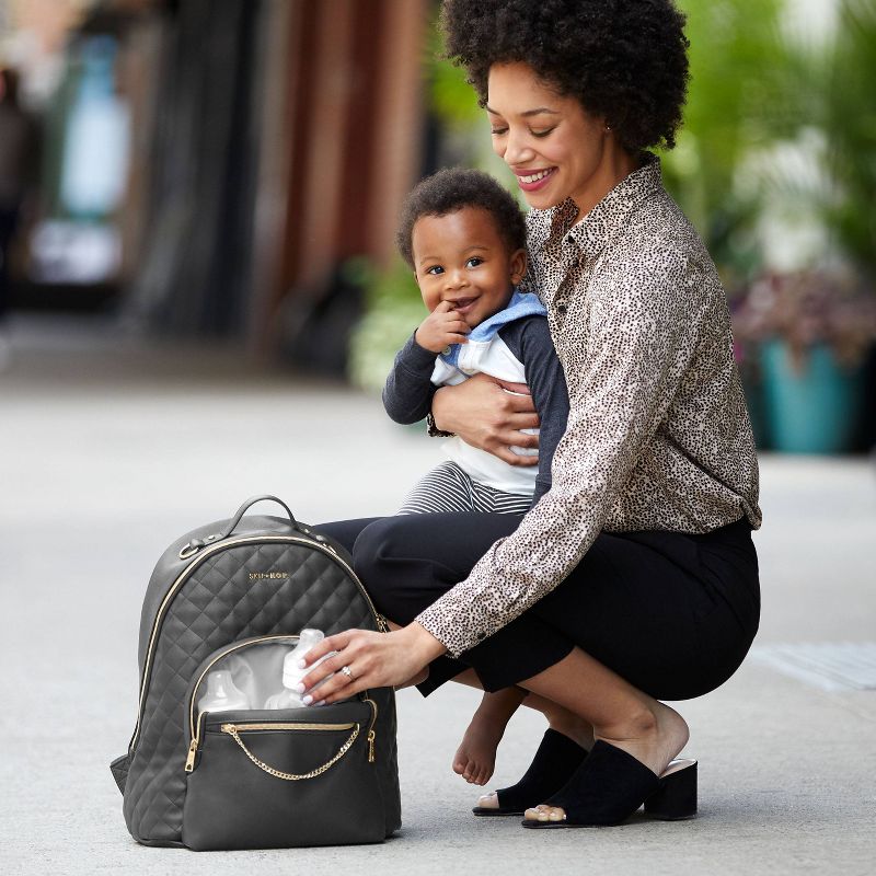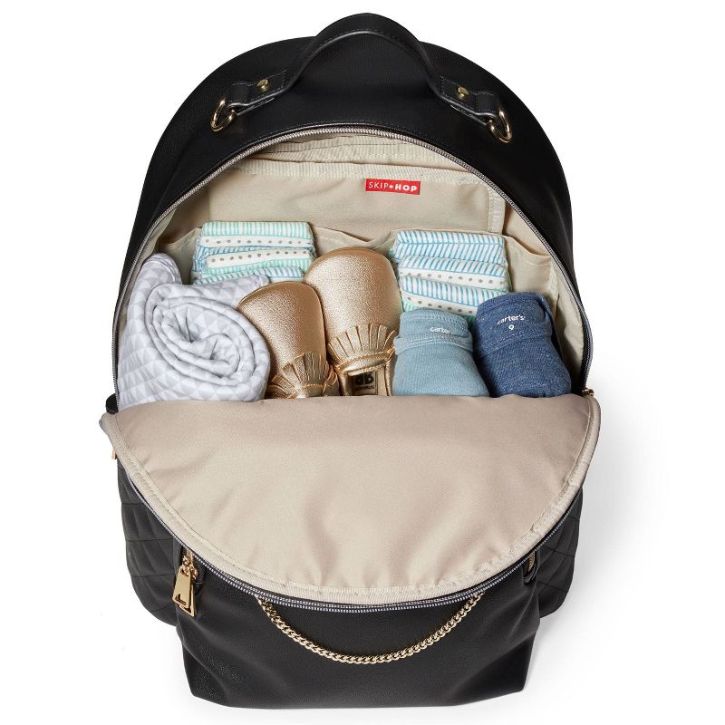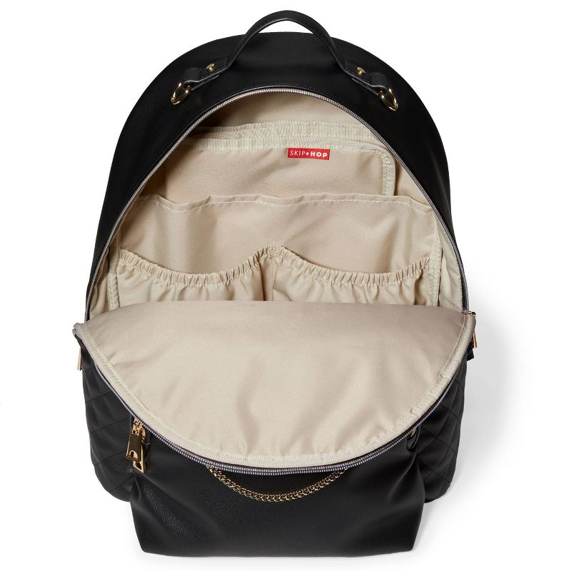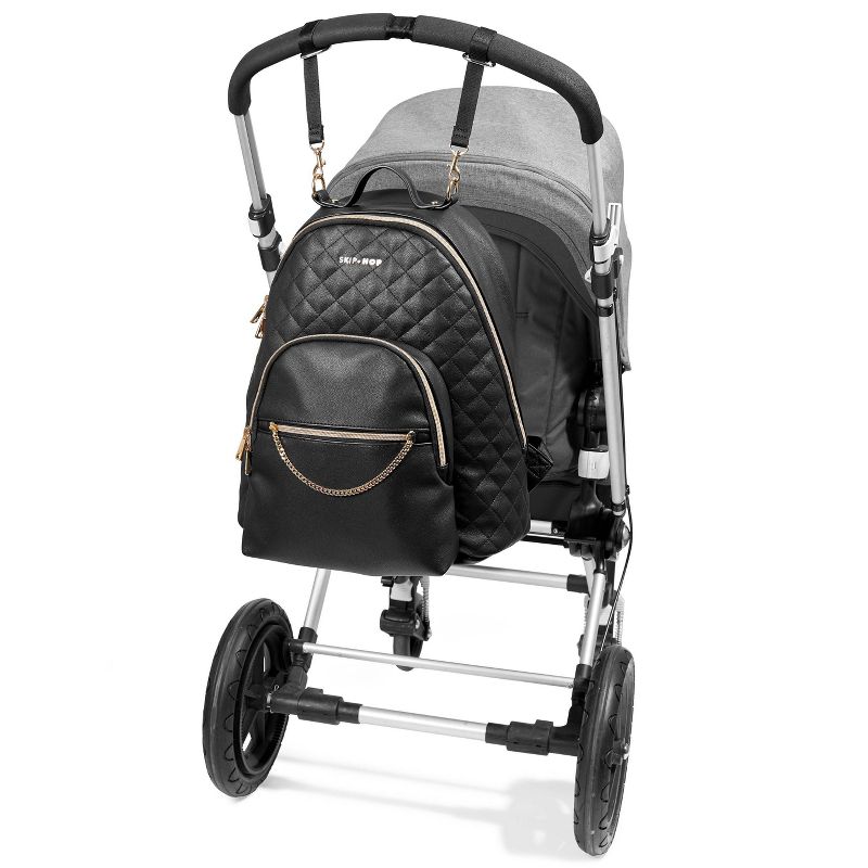 •Nine pockets include front zip pocket with chain accent for parent essentials