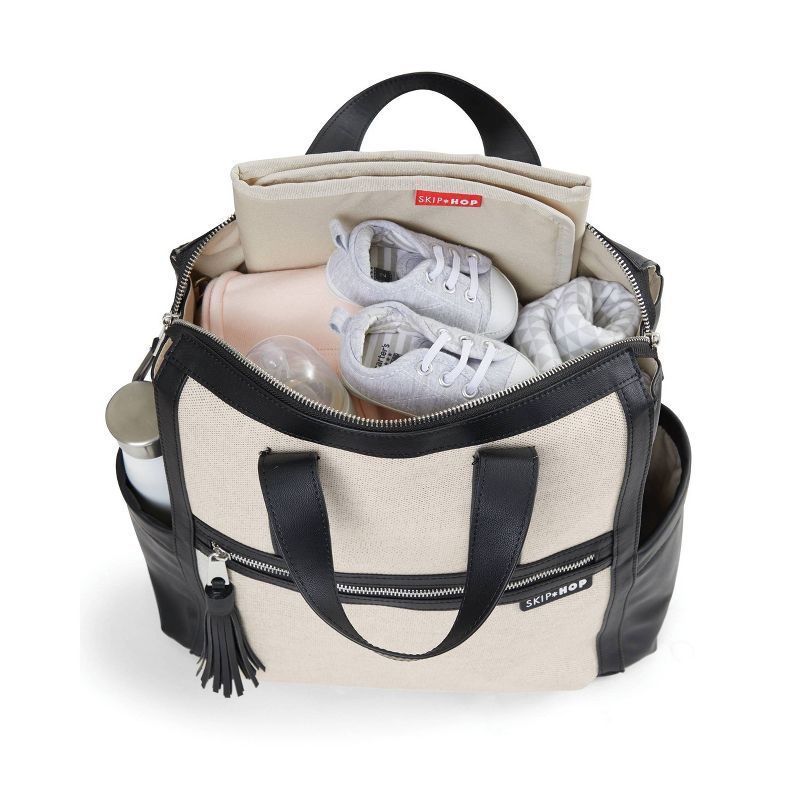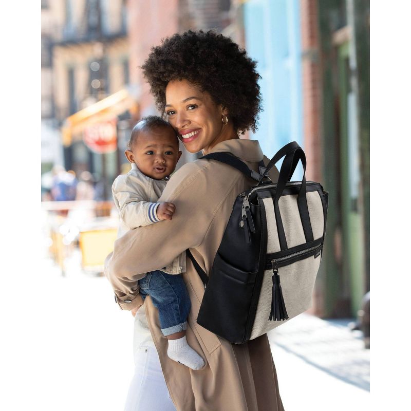 Durable coated canvas plus luxe vegan leather give this spacious Skip Hop diaper backpack extra polished style that works everywhere. Packed with eight pockets for easy organization, we also included a matching wristlet that’s perfect for errands.
