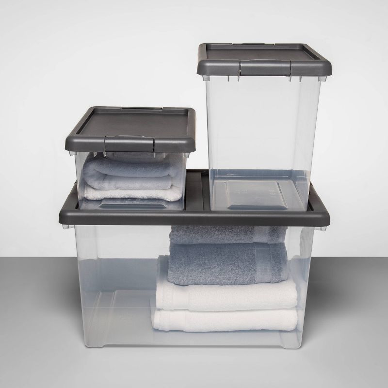 Keep your space tidy and make the most of your storage space with the Small Clear Latching Storage Bin from Made By Designâ„¢. Made with a durable, clear polypropylene material, you can see everything you have stored inside, making it easier for you to find the items you're looking for. The audible click of the secure latches lets your know the lid is held in place, protecting the contents from dust and moisture. Make your storage even more convenient by stacking up to five other modular stacking storage bins from Made By Design (sold separately) on top to make the most of your space.
