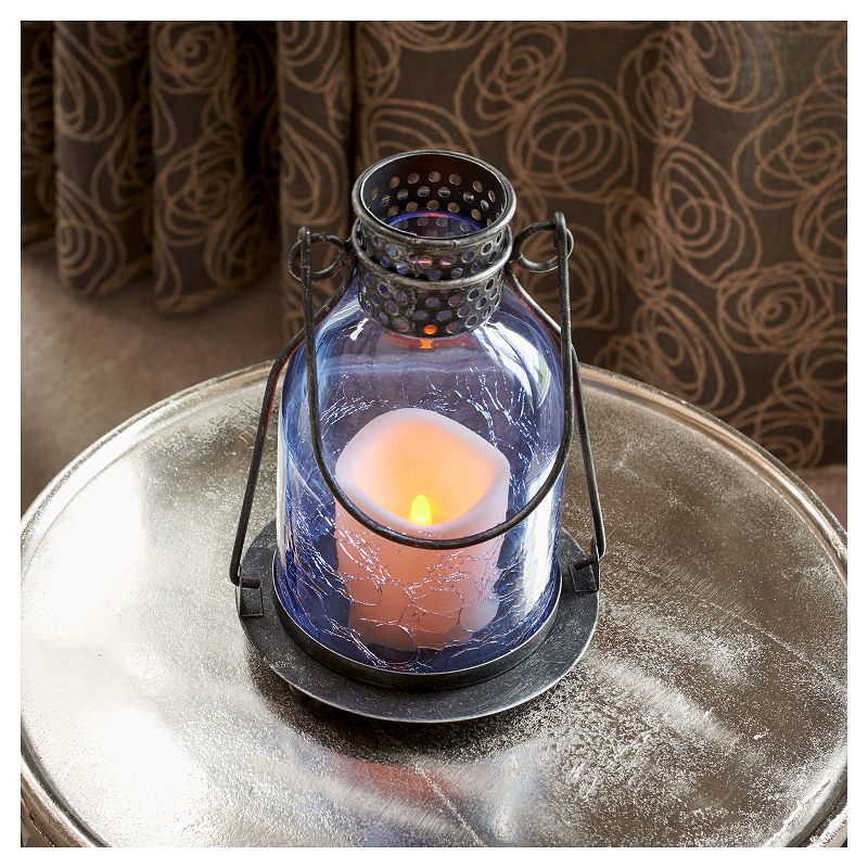 Add a wealth of warmth to your home with this lovely Monaco Glass LED Candle Lantern from Smart living. This glass lantern is crafted from beautiful crackled blue glass and holds a decorative LED candle within to add a soft glow to your space. The simple yet sturdy lantern comes with a weather-resistant frame to provide cozy, warm ambiance for both indoor and outdoor entertaining. This lantern comes with a handy three-way on/off switch with a six-hour timer for fuss-free lighting. This warm and homey lantern, with its subtle, soft glow, works great as a tabletop piece for your dining area, or can be suspended from the porch beam as a great lighting option when dining outdoors.