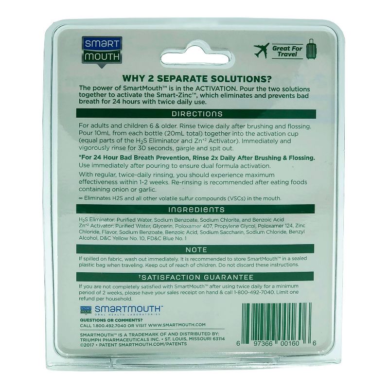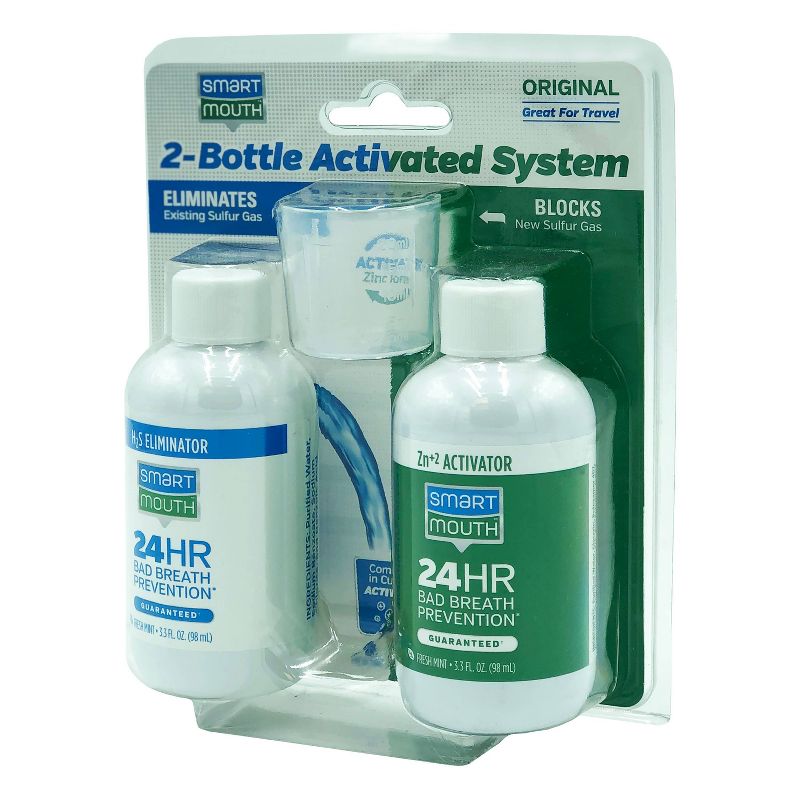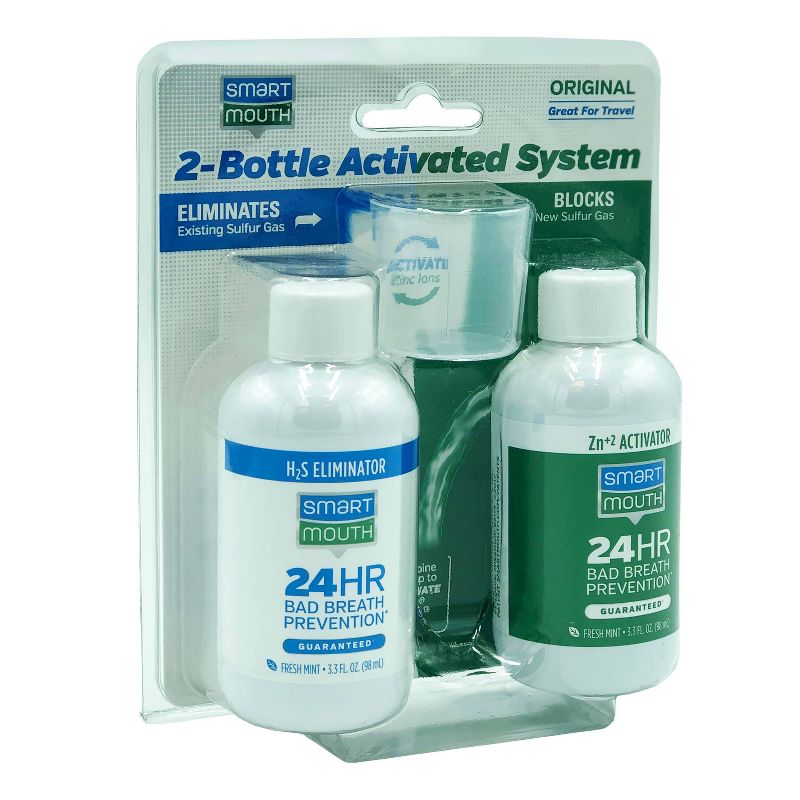 SmartMouth 2-Bottle Activated Mouthwash System is a travel-friendly, 1-week supply of mouthwash that makes it easy to take on the road. These TSA-compliant 3.3oz bottles keep the Sulfur Eliminator and Zinc Ion Activator separate until you’re ready to rinse. SmartMouth stops the real cause of bad breath, sulfur gas. This SmartMouth set will help keep bad breath away.