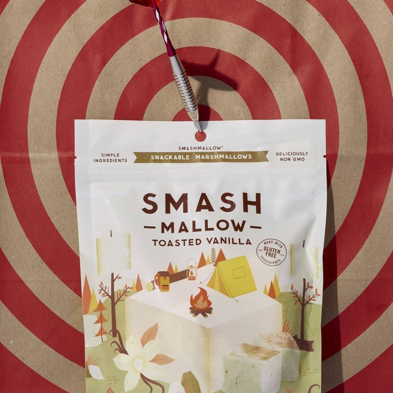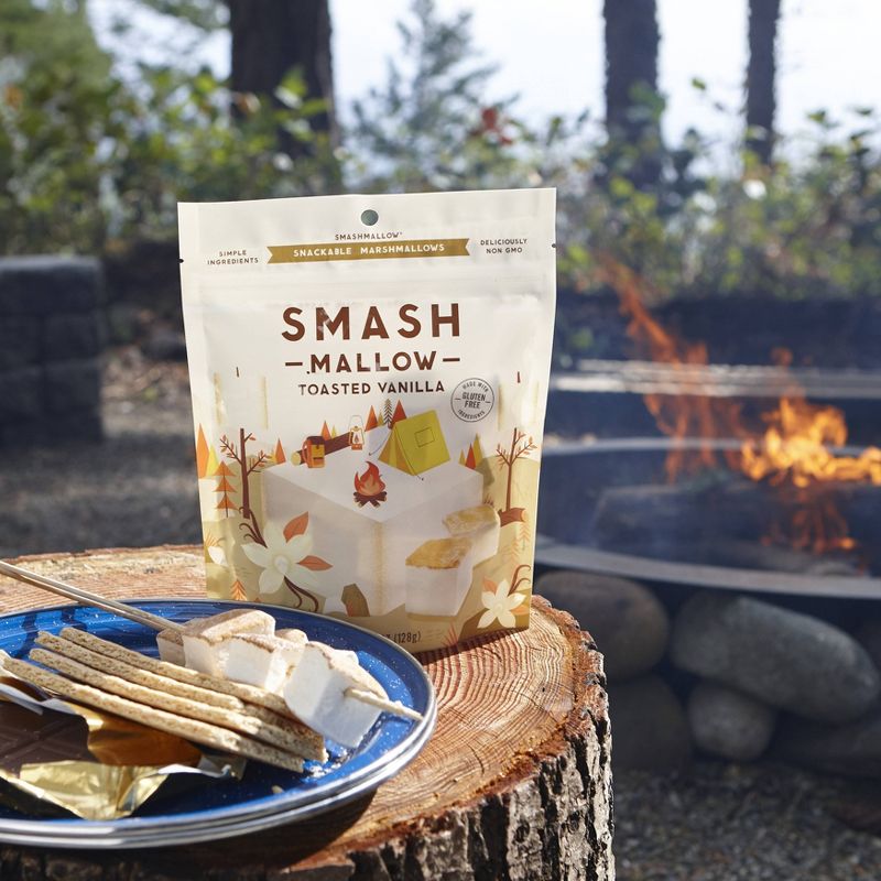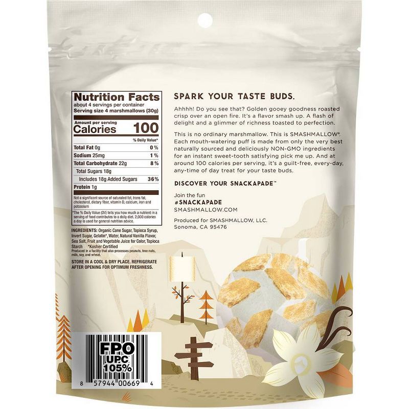 Ahhh! Do you see that? Golden gooey goodness roasted crispy over an open fire. SMASHMALLOW Toasted Vanilla is a flavor smash up. A flash of delight and a glimmer of richness toasted to perfection. This is no ordinary marshmallow. This is SMASHMALLOW. Each mouth-watering puff is made from only the best naturally sourced and deliciously non-GMO ingredients for an instant sweet-tooth satisfying snack. And at around 100 calories per serving, it's a guilt-free, every-day, any-time treat for your taste buds.