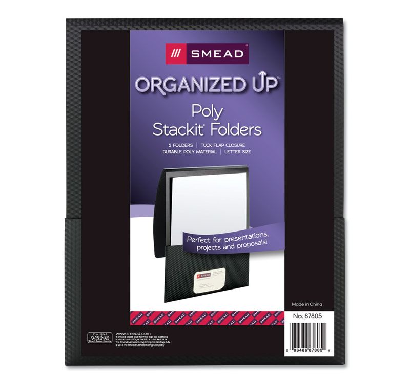 Showcase your presentations. Store individual proposals or projects without three-hole punching or fasteners. The tuck flap secures documents in place when you are on the move. The vertical orientation makes it easy to access documents and is backpack friendly. Made from durable polypropylene, these folders feature a straight-cut flap that can either be tucked in or left open and can hold up to 100 sheets. Includes a business card slot for personalization. Front Cover Color(s): Black; Back Cover Color(s): Black; Sheet Size: 11 x 8 1/2; Capacity Range [Max]: 1". Great for dressing up presentations, projects and proposals. Pocket holds up to 100 sheets of paper. Tuck flap keeps paperwork safe and secure. Vertical orientation is backpack friendly and makes accessing documents easy. Sold as 5/Pack.