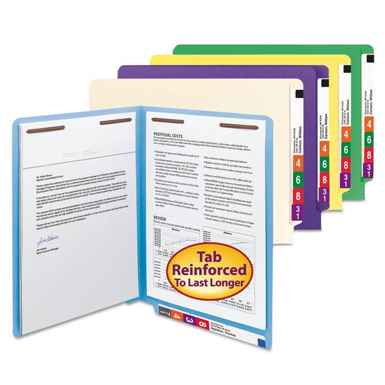 Protect your documents with office friendly fastener folders that resist liquid spills and are dirt and finger oil resistant, while significantly reducing paper cuts. Special CutLess® fastener folders reduce the incidents of paper cuts, while WaterShed® fastener folders resist stains. Fasteners allow you to subdivide papers within the folder while holding paper securely inside. Use color to categorize different types of folders in one system. Labels sold separately. This product was made using wood sourced from a certified managed forest.