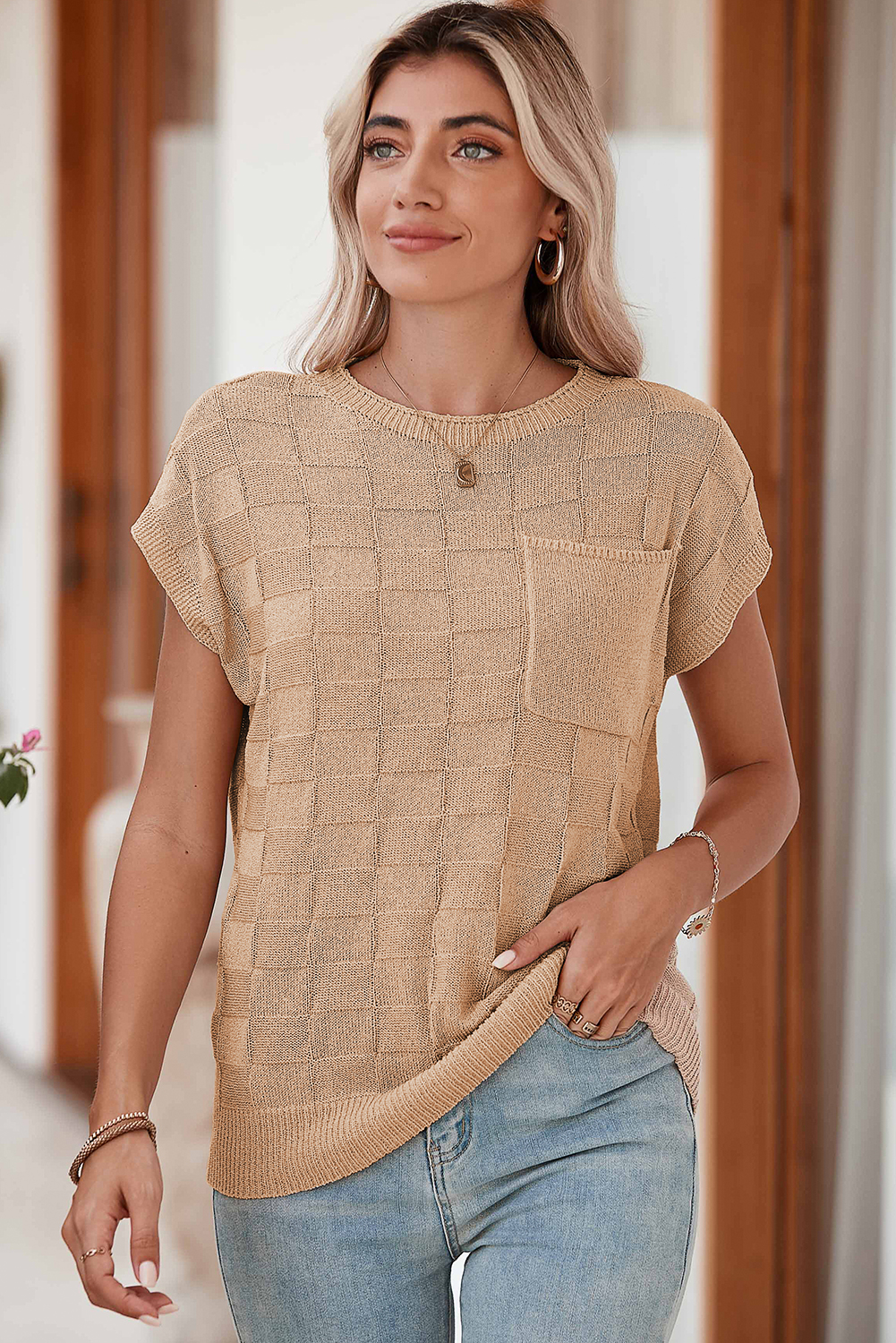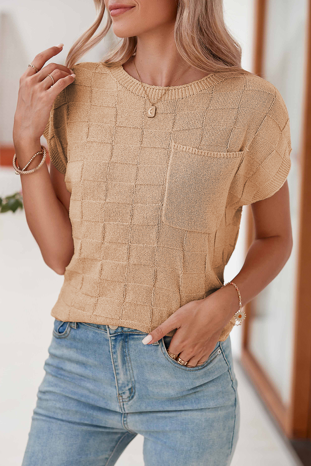 The breathable knit fabric ensures a cozy and relaxed fit, while the modern lattice texture adds a trendy twist.