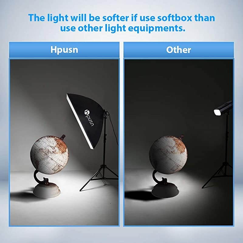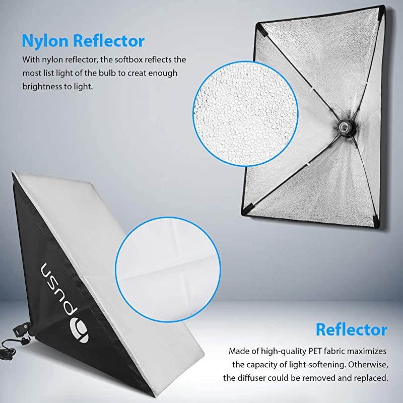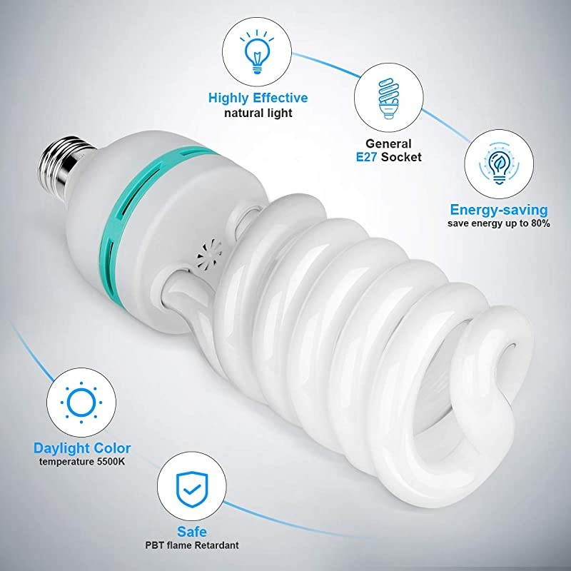 **********High Quality MaterialThe softbox is made of high-quality PET and maintains good reflective performance in a relatively closed softbox environment and under long-term bulb heating. Meanwhile, the softbox does not release unpleasant odours when the bulb is continuously lighting. *****Energy Efficient Bulbs With a standard E27 socket, 2 x 85W CFL bulbs supplied are equal to the 800W incandescent bulb in total to save energy up to 80% and last approx. 8000 hours, with 5500K color temperature, bulbs produce balanced pure white daylight lighting and continuous uniform light, providing a good photographic environment.