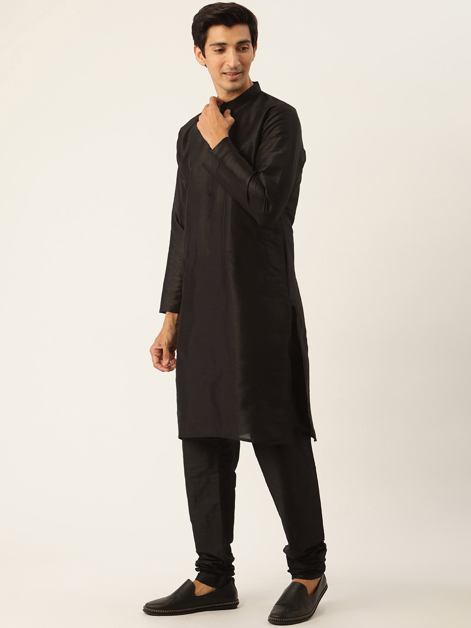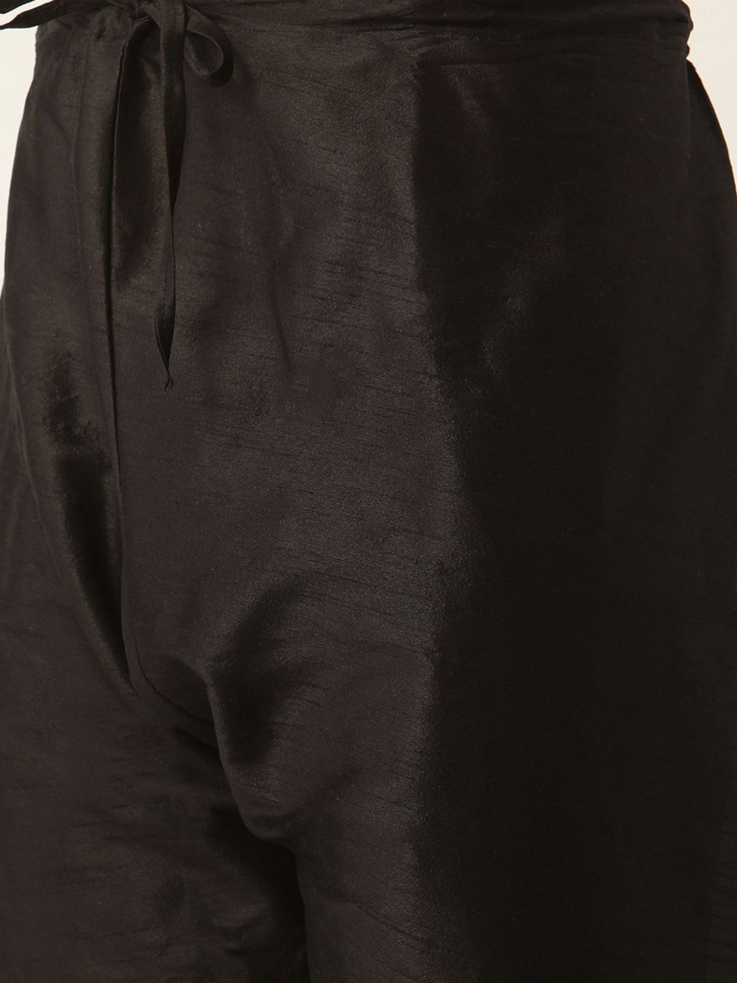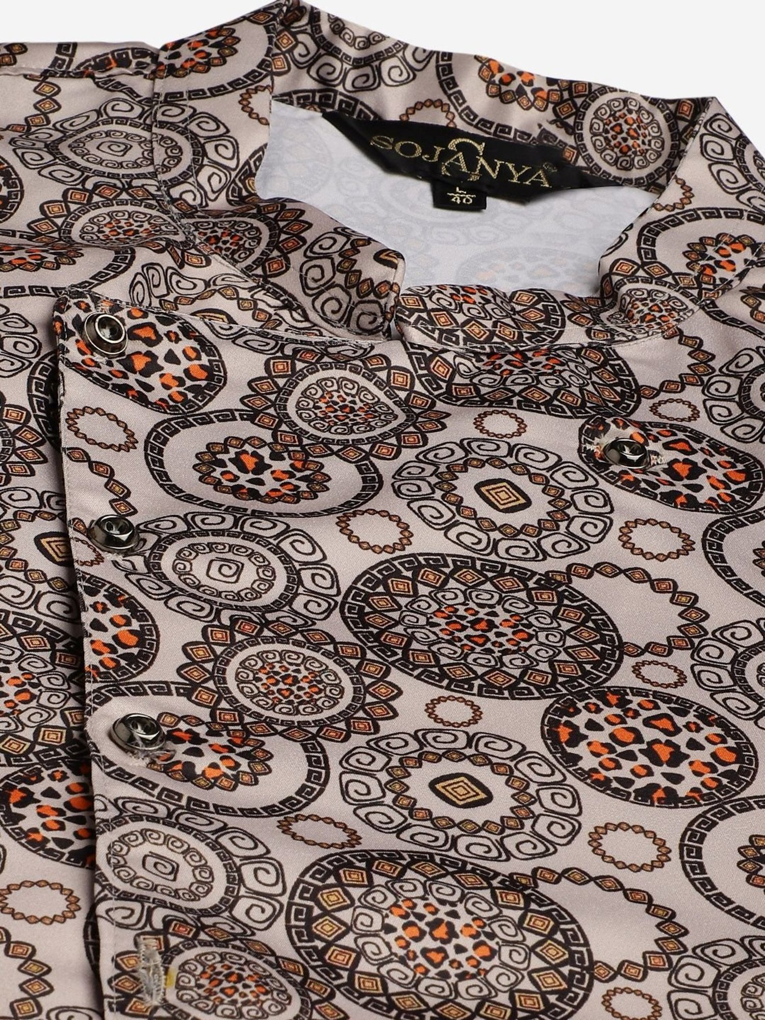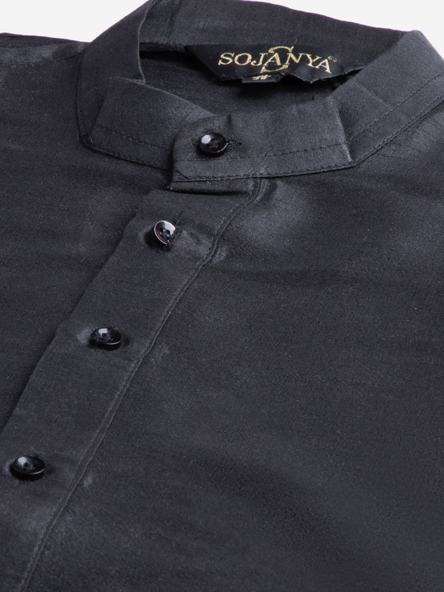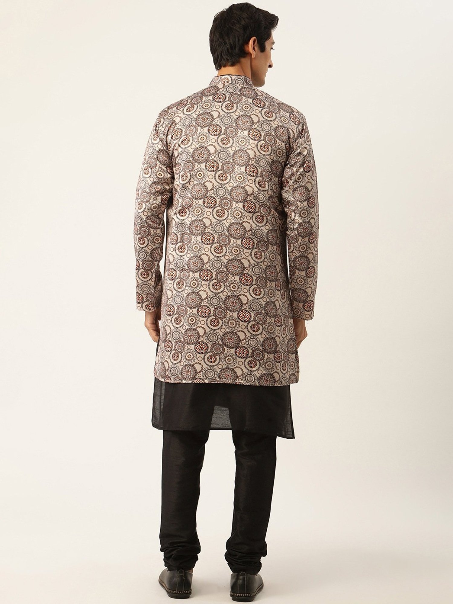 Attain exemplary perfection of style by donning this black and beige regular fit kurta set with jacket from Sojanya. Tailored to sartorial perfection from premium quality fabric, it assures a soft and soothing touch against the skin. The mandarin collar augments its design. Exuding full sleeves, it is sure to fetch you compliments from all. The printed pattern makes it a captivating choice.
