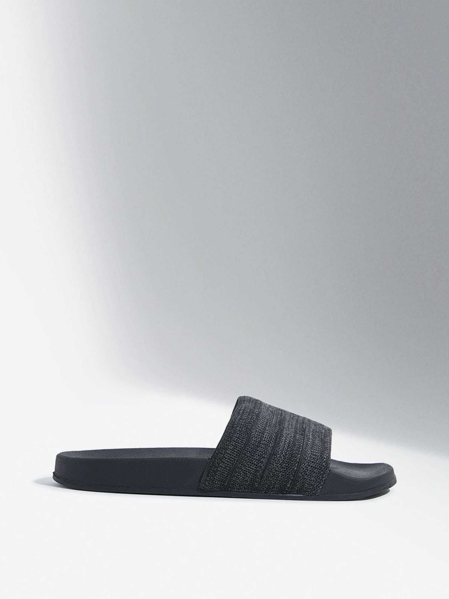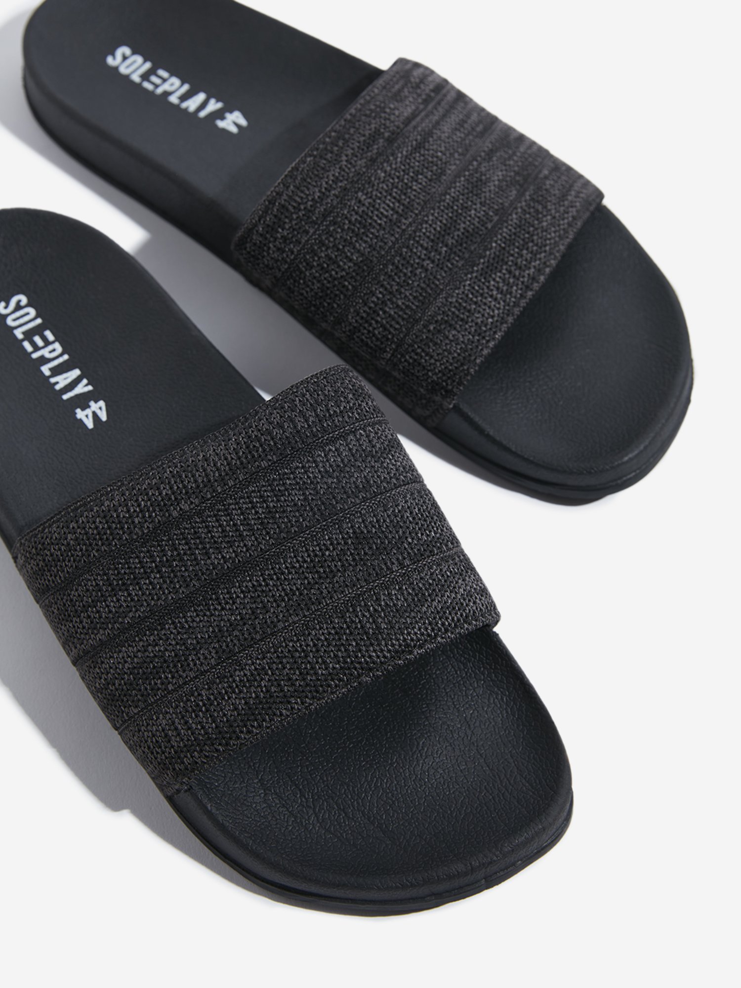 These dark grey pool slides from Soleplay feature a knit-textured upper and are made from durable materials. They include a cushioned insole and a textured outsole for a comfortable walking experience.