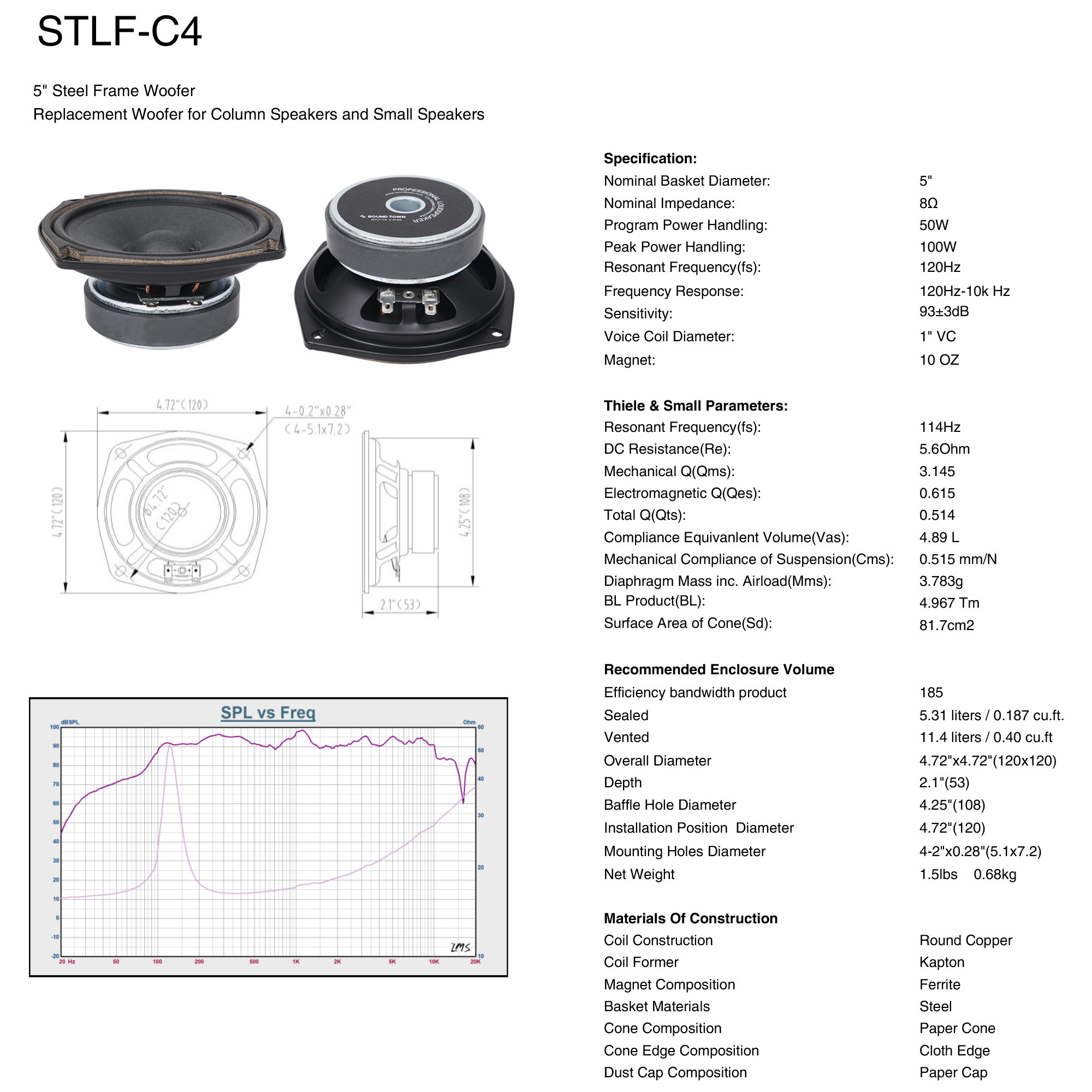 The Sound Town STLF-C4 is a 5” universal loudspeaker replacement for PA/DJ speakers and column speakers; it is compatible with the Sound Town PA speakers and speakers of other brands which need a 5” woofer. The woofer comes with 8-ohm impedance and has a frequency range of 120 Hz - 10 kHz. It is built in a steel chassis and has a paper cone with cloth edge. With 60W RMS, 120W peak power handling capability, the STLF-C4 delivers superb sound performance.