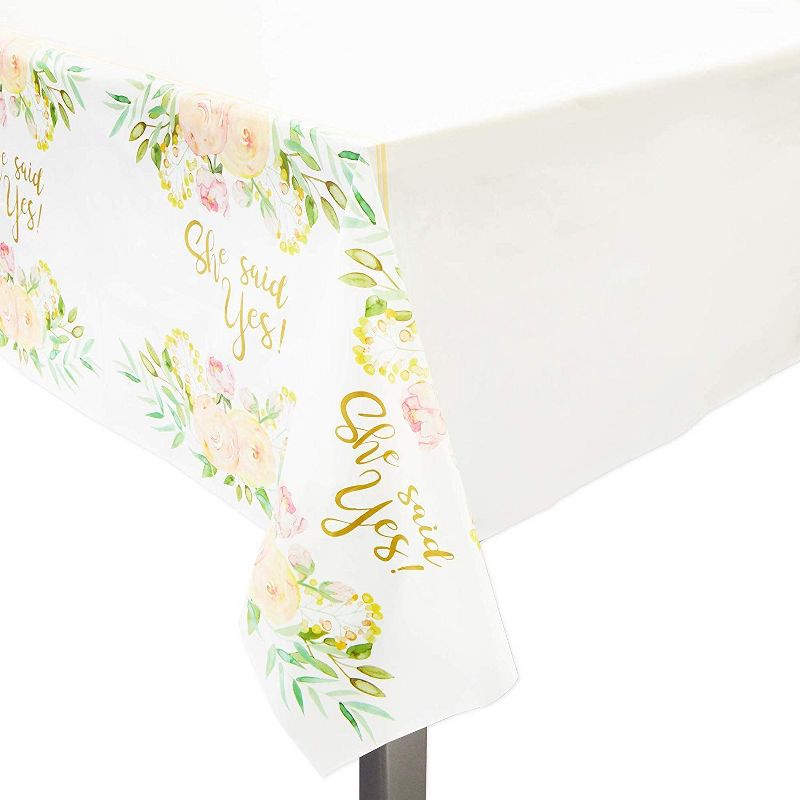 This set of decorative party packs contains a set of plates, napkins, cups, cutlery and table cover for serving up to 24 guests in bridal shower, engagement party and wedding. The materials are printed with floral and gold foil design with a “She said yes!” theme. This set of party supplies is disposable and is ideal for quick cleanup after the party.