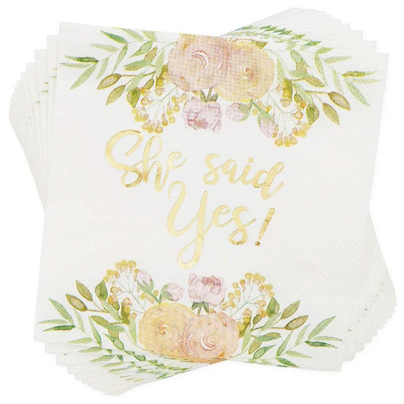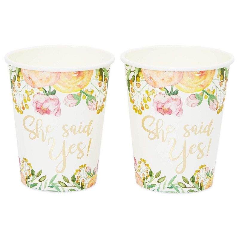 • BRIDAL PARTY DECORATIONS: Tableware set, napkins, and paper cups feature floral designs and gold foil print that reads "She Said Yes"; ideal for creating a celebratory atmosphere for your upcoming bridal party or engagement party