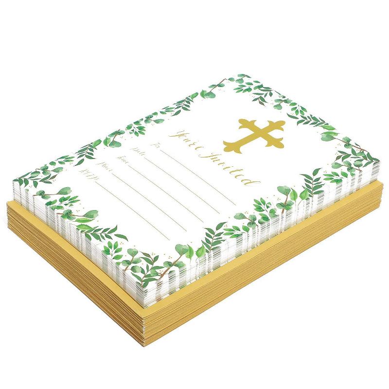 • ELEGANT DESIGN: Featuring a white color background printed with the gold Christian cross in the center and beautiful green foliage on the edges. The title underneath reads "You’re Invited" The card comes with writing space to fill with the occasion, date and time, place, and RSVP