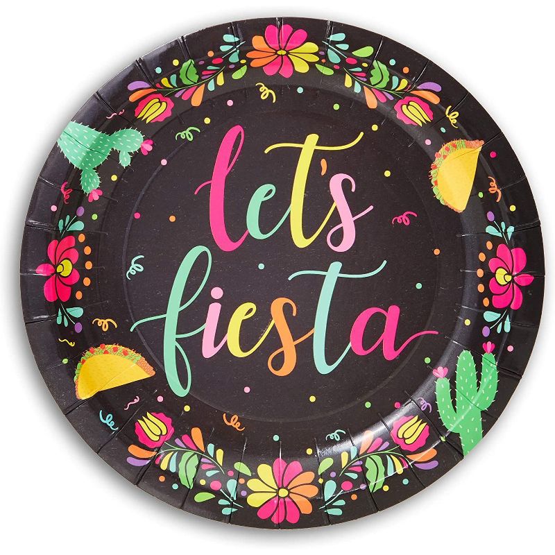 • FIESTA PARTY DECORATIONS: The black paper plates feature colorful flowers and tacos; ideal for creating a celebratory atmosphere and perfectly coordinated theme for your Mexican theme party