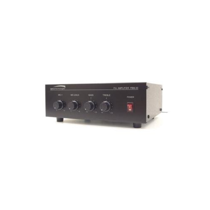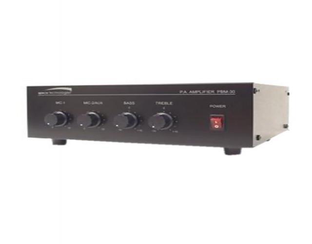 Speco 30W contractor series PA amplifier. UL Listed. Two channels. Auto mute function. Music on hold output with separate level control (600 ohm line and one watt 8 ohm). 600 ohm telephone line input with level control. Manual muting contacts. Accepts inputs from two sound sources. Outputs include choice of 4, 8, and 16 ohm as well as 70 and 25 volt line outputs.