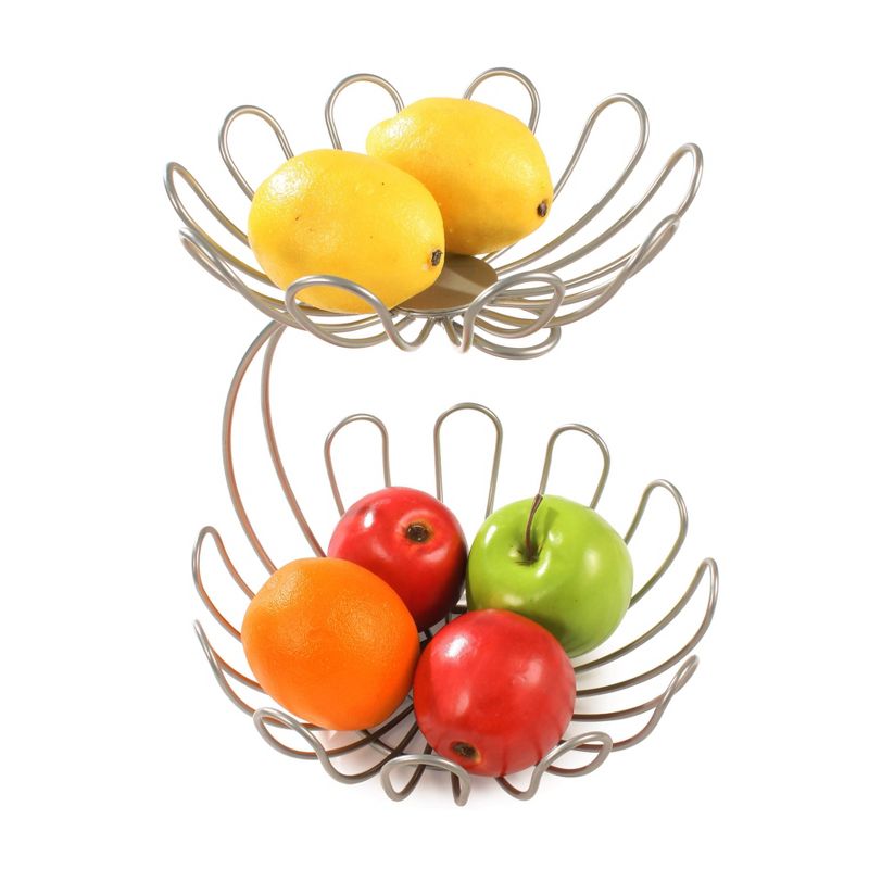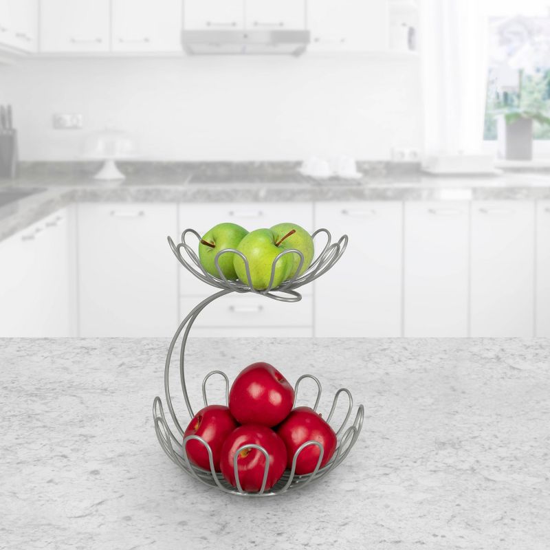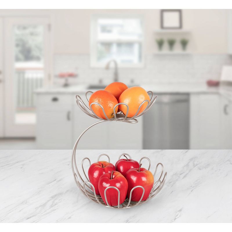 Organize your favorite fruits and vegetables in one convenient place with Spectrum’s Bloom™ Arched 2-Tier Fruit Server. Two open bowls allow fruits and vegetables to ripen evenly while offering quick and easy access to your fresh produce. Inspired by the blooming flowers of spring, this stylish piece will add a fresh and modern look to your kitchen. Made of sturdy steel.