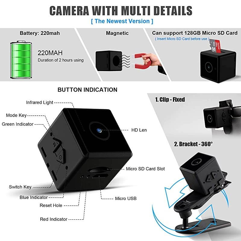 **********A super small compact spy cam, upgraded with built-in strong magnet and auto switch night vision. This spy camera wireless hidden measures less than one inch size, easy to hide anywhere. Shooting incredible 1080P HD video and12MP photo. Best Spy gadgets and spy gear, you can take this camera for personal security, home surveillance, housekeepers or a nanny, baby, pet, body safety or action and drone use. *****Motion Detection & Loop Recording. Offering 100 MINUTES of battery run time. Or You can plug to the power outlet to leave it out 24/7.
