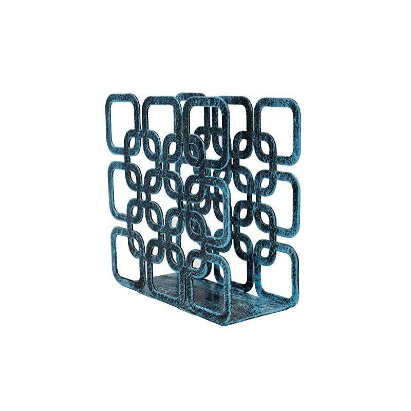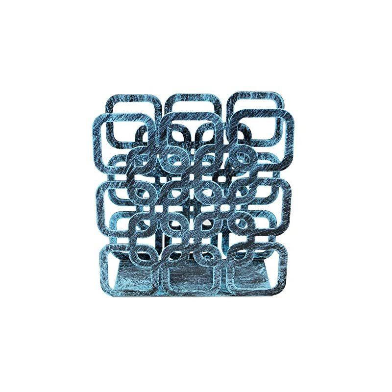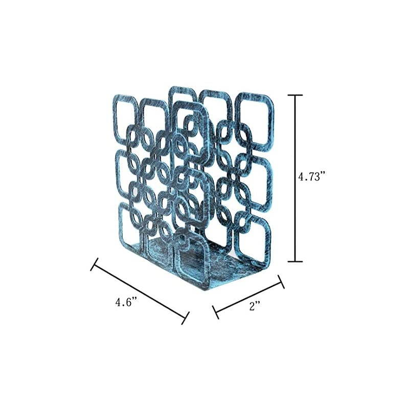 Approximate Dimensions (in inches): 4.7 W X 4.6 H X 2 D Decorative Holder Made of sturdy with a matte turquoise powder-coat finish, this decorative napkin stand boasts an intricate cut-out design of a square shape, adding a unique element to meal time. Everyday Use A great way to keep napkins close at hand on your counter, tabletop or ready for parties and buffets. The open side and top design allow you to easily replace napkins and dispense for quick messes or meals. Ideal for square paper napkins, this dispenser can hold rectangular or cloth napkins as well.