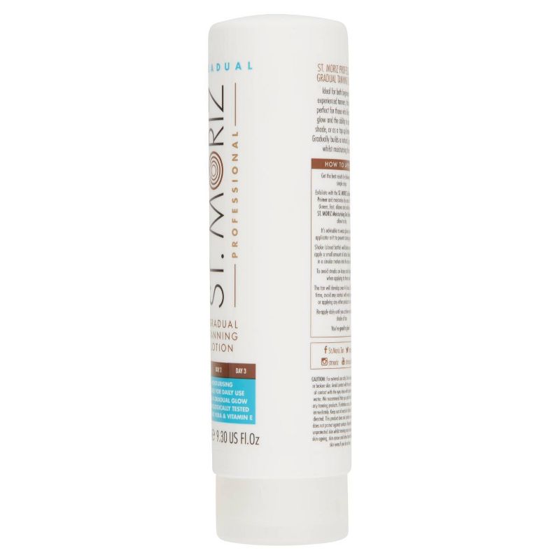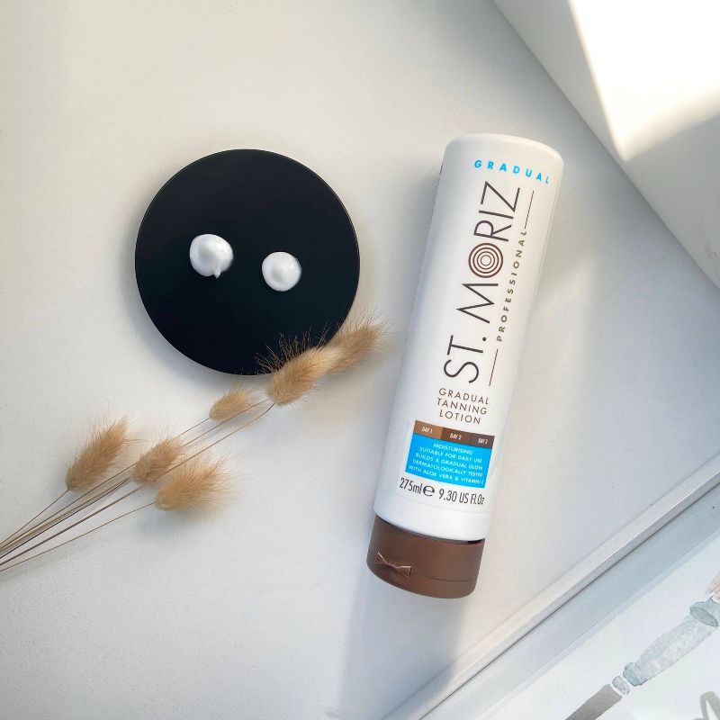 St. Moriz Professional Gradual Tanning Lotion offers a natural golden tan with a professional finish. This lotion gradually builds a natural, glowing tan whilst moisturising the skin. Ideal for both beginners and experienced tanners, this lotion is perfect for those who like a subtle glow and the ability to control the shade as an ideal top up product between tans. The first day gives you a subtle glow that builds over time with daily use. Our unique blend of beautifully fragranced active tanning agents work their magic, leaving you looking subtly bronzed and ready for anything. This salon professional formulation is ultra easy to apply, quick drying and very moisturising, great for dry skin. Enjoy St. Moriz Professional Gradual Tanning Lotion for natural, long lasting, salon professional results.