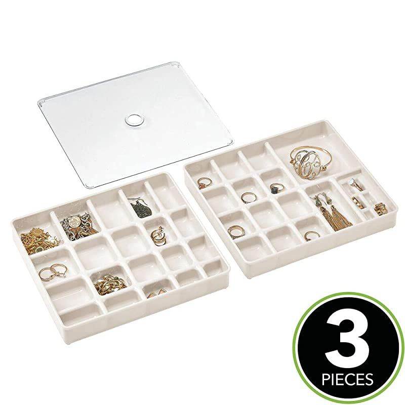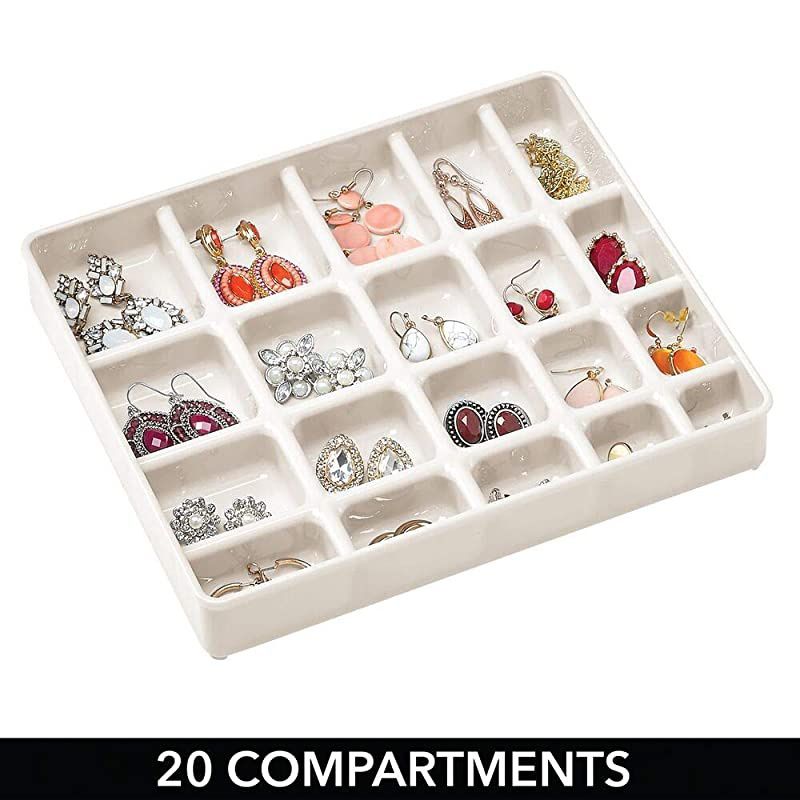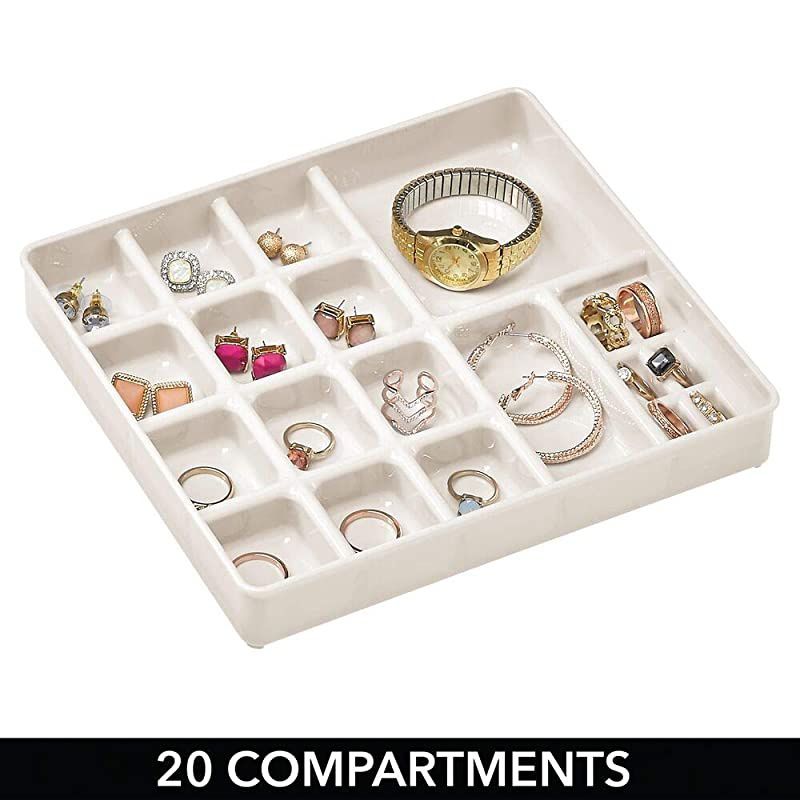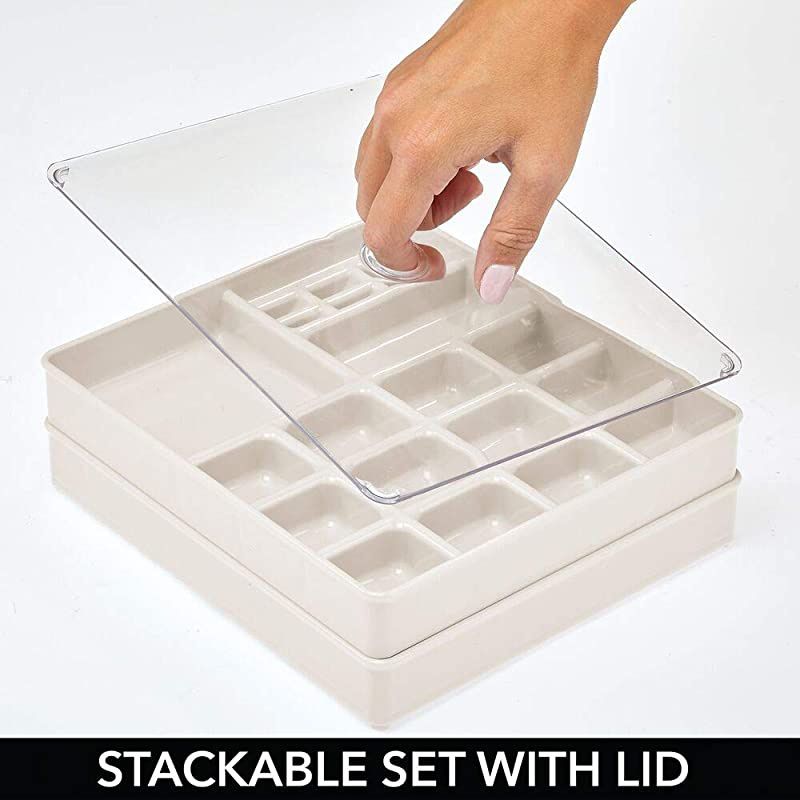 Color: Cream/ClearKeep your jewelry and accessories neatly organized with the Stacking Jewelry Organizer from. Two clear trays have 40 various sized compartments to separate and organize necklaces, bracelets, rings, earrings, and more. Each tray is stackable to create vertical, space-saving storage. A clear lid fits over the top tray to keep jewelry and accessories in place. The clear construction makes it easy to see what's stored in each compartment, and the compact size easily fits inside a standard drawer.