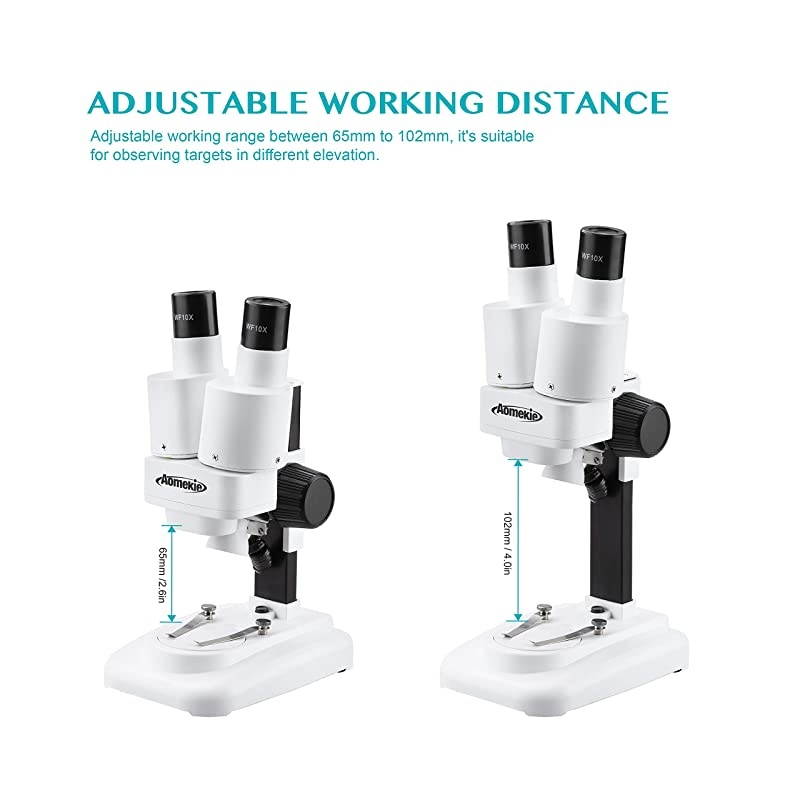 *****Microscopio: It is good for home or classroom use enables students and hobbyists to inspect biological specimens. And it is perfect for 3D objects, SMD Repair, observations of coins minerals stamps small electronic components, etc*****With WF20x WF10x eyepieces, 40x magnification, ideal for viewing a large range of specimens, 2X objective provides longer focal length so enables users to manipulate the object being inspected. Adjustable working range between 2.6 inch/65mm to 4.2 inch/102mm, it' s suitable for observing targets in different elevation. *****LED light source reflects light off the specimen. An LED light source provides bright, cool light for working with temperature-sensitive or live specimens. The light is powered by two AA batteries ( not included), enabling the microscope to be used away from wired power sources.