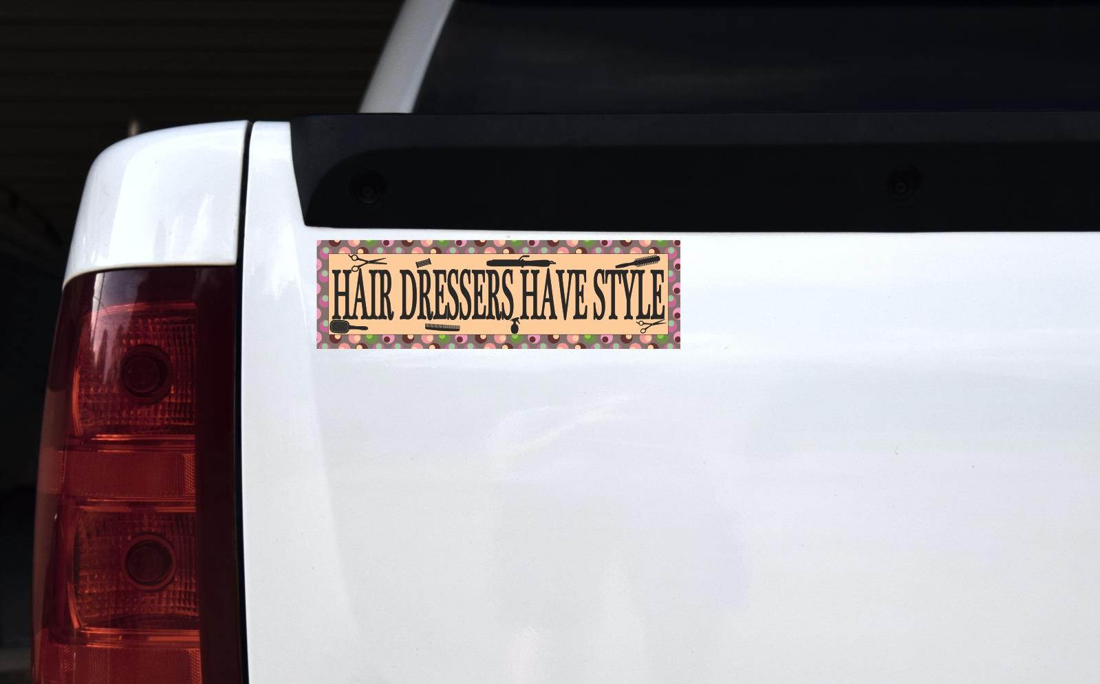 This magnet is 10 inches wide by 3 inches tall when applied. It features the words, HAIR DRESSERS HAVE STYLE, in black letters on an apricot background. Black silhouettes of styling tools surround the text. The border of the magnet is light brown with colorful polka dots. This quality product is a creative way to share your love for your creative career! However, it only attracts ferromagnetic metals.