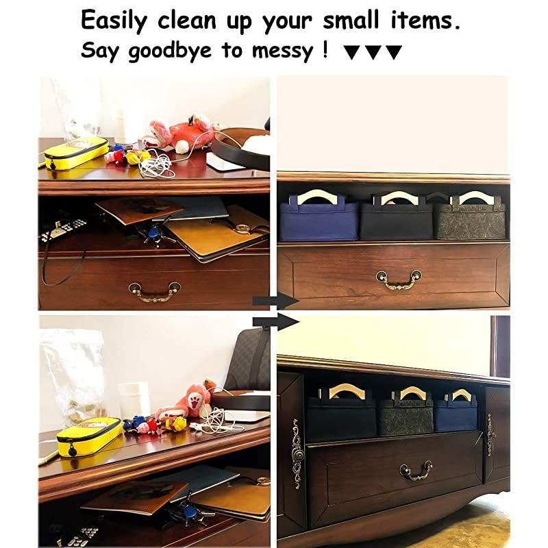*****PRODUCT DIMENSIONS: Available in 3 different sizes LARGE ONE is 14.8 '' x 10'' x 5.1 '', the MEDIUM is 13" x 8.9" x 4.5", and the SMALL one is 11.4 '' x 7.1 '' x 3.9 ''. Our felt storage basket would be a good choice to do the collection. Its useful for home, office, colleague, dormitory, hotel and everywhere. *****MULTI-PURPOSEGreat storage basket organizer for books, magazines, toy storage, dog toys basket, shoe basket, clothes basket, shelf, baby bin, pet toy storage, towel basket, blankets, decorations, office supplies, DVD and gifts. *****WOODEN