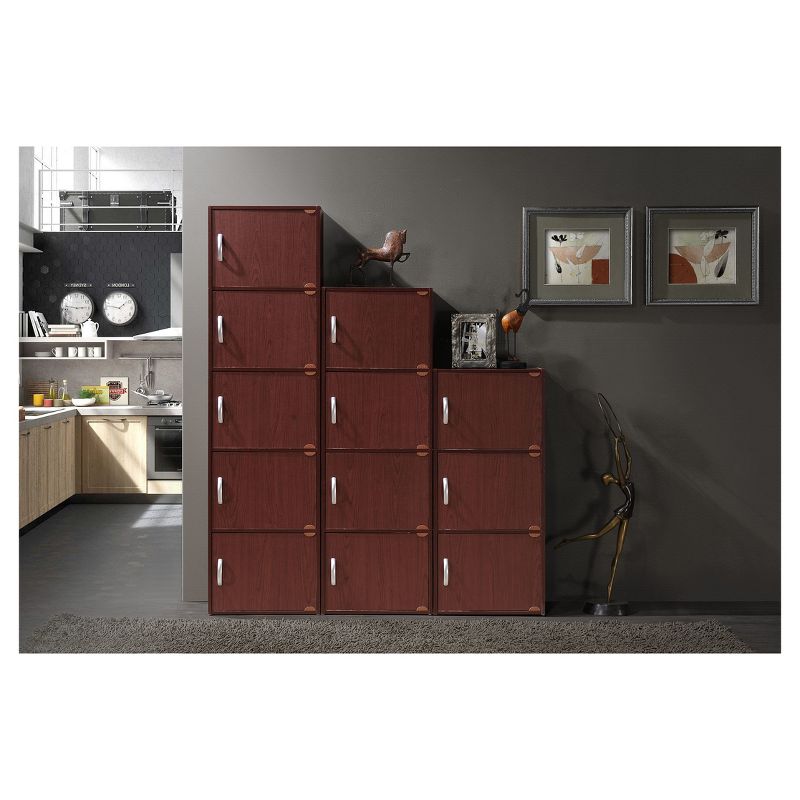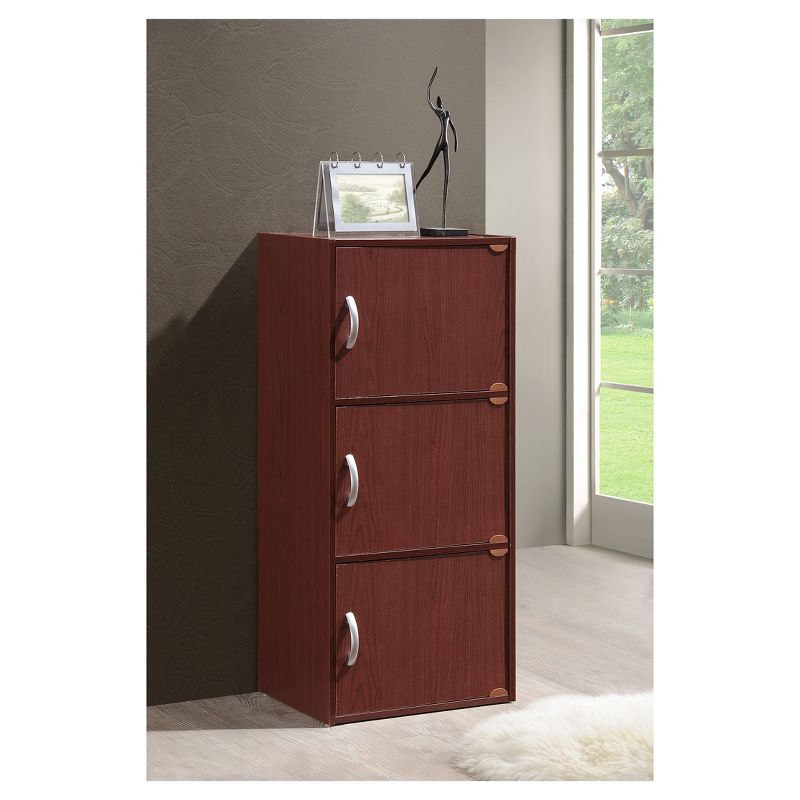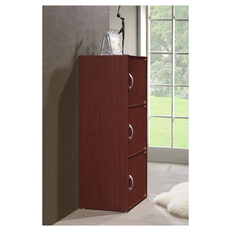 Add a beautiful statement to the room with the Hodedah Import Cabinet - Mahogany. This structured piece of home furniture both catches the eye and offers spacious storage thanks to its unique design and multiple compartments. Featuring cabinets with hinged doors, artful detailing at each corner, modern silver door handles and a rich finish.