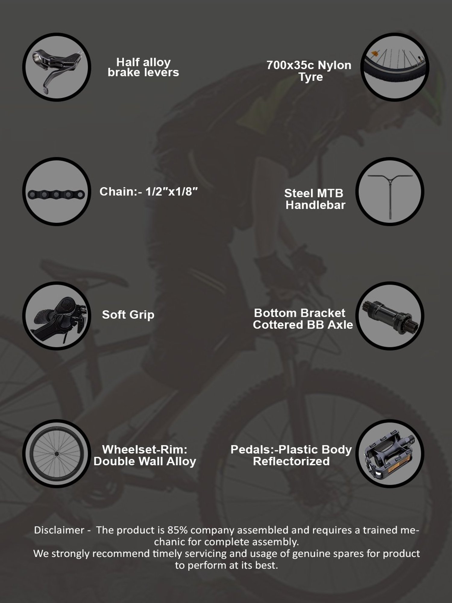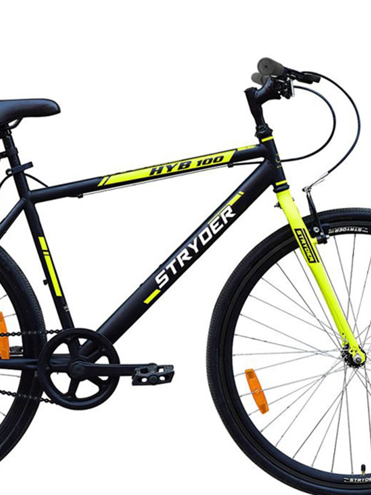 Bring a broad smile to your face with this Stryder HYBRID-100 bicycle in 700C wheel size. Equipped with V-brake & double-wall rims. It is ideal for age above 15 years. It comes with a 19-inch frame with adjustable handles and saddles. It has a warranty of 3 years on frame and 2 years on the fork. The box contains 1 semi-assembled bicycle, 1 saddle, 1 seat pillar, 1 white reflector with bracket, 1 red reflector with bracket, 4 yellow wheel reflectors and 1 pair of pedals. Primary Ingredients: Other Ingredients: