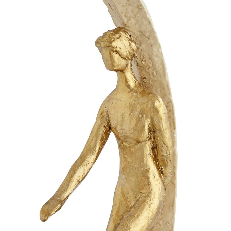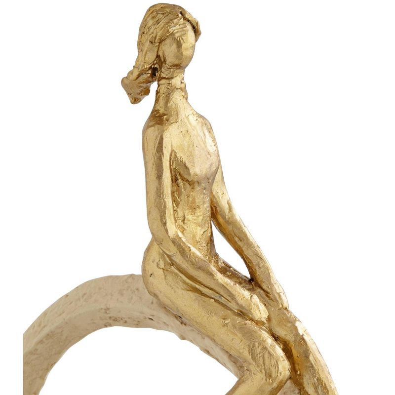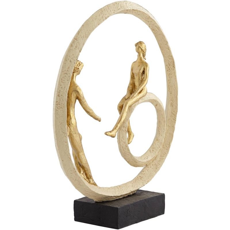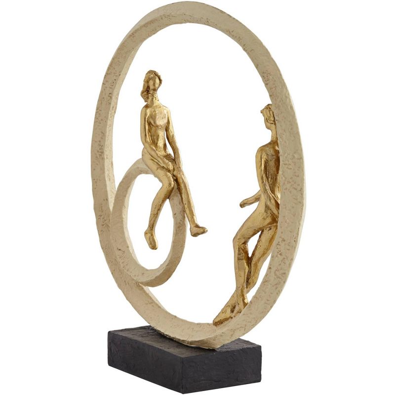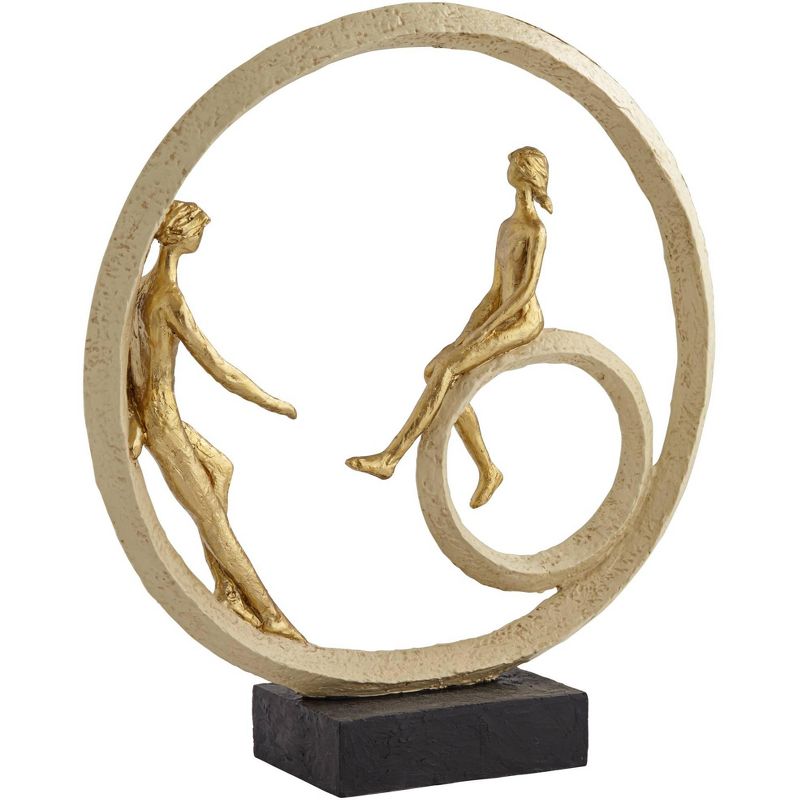 This contemporary polyresin sculpture boasts a rough gold finish and plenty of visual interest. Inside a circle you'll find a couple casually spending time together. This is a hand-made sculpture that's crafted by Studio 55D.
