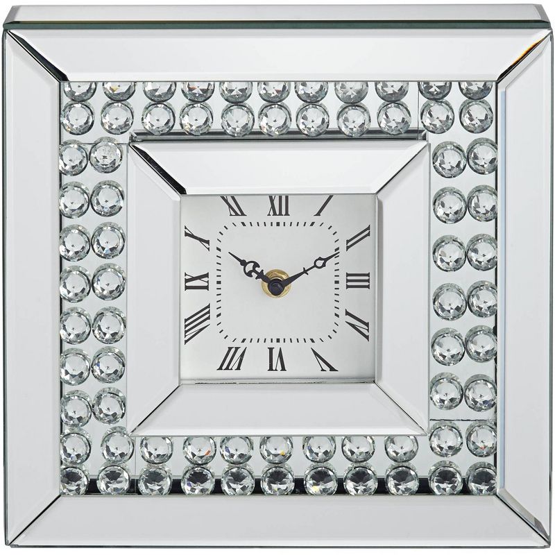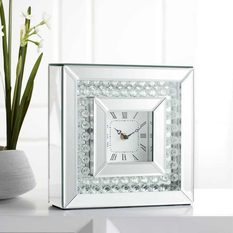 Tell time with a contemporary twist thanks to this grand, elegant silver and crystal table clock. An elegant square shape with a glossy silver finish yields a gorgeous case with an inner frame of crystal beaded rows. Roman numerals lend a traditional touch to a clock that keeps pace with a subtle, gentle ticking sound. On a fireplace mantel or end table, this exquisite clock offers a stylish upgrade.