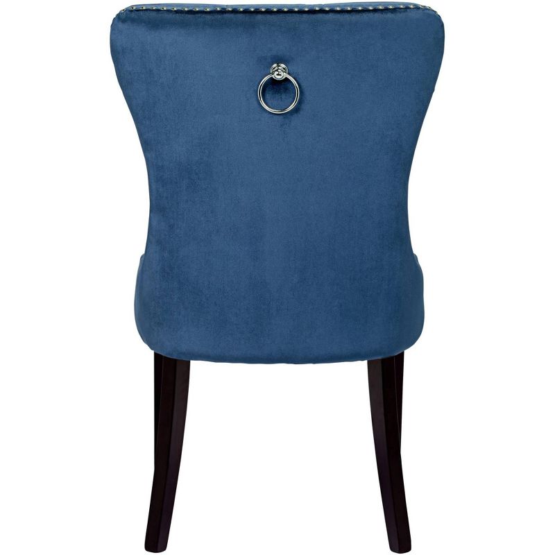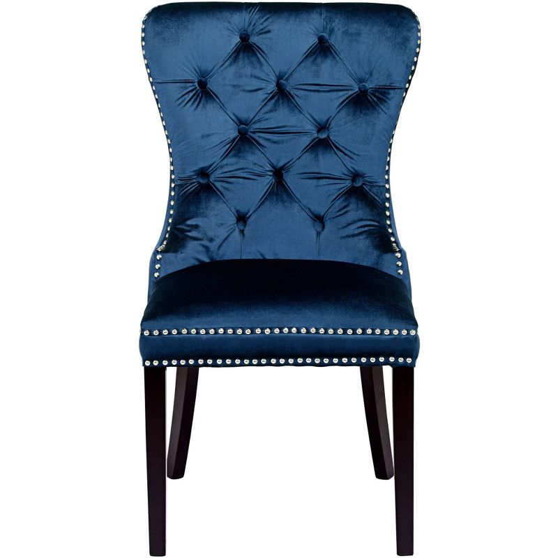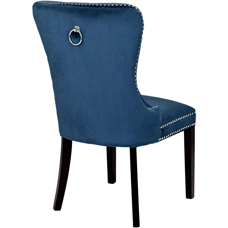 This tufted dining chair offers a fabulous contemporary style with elegant traditional elements. It comes in a rich blue velvet upholstery with hand-crafted button tufts and a chrome nailhead trim. Dark espresso finish legs add an alluring touch. Chic and classy, this chair is perfect for modern or luxe settings. Price is for one chair only.