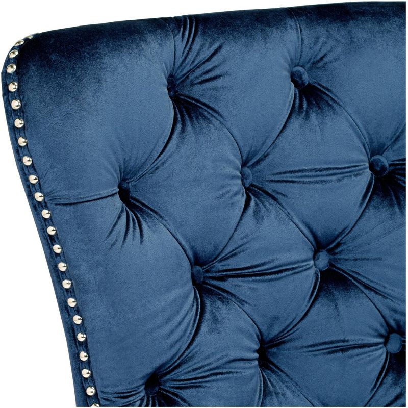 • Blue velvet fabric with hand-crafted button tufting details. Chrome finish nailhead trim.