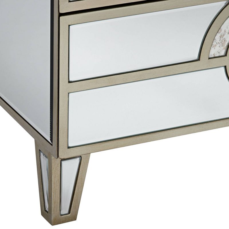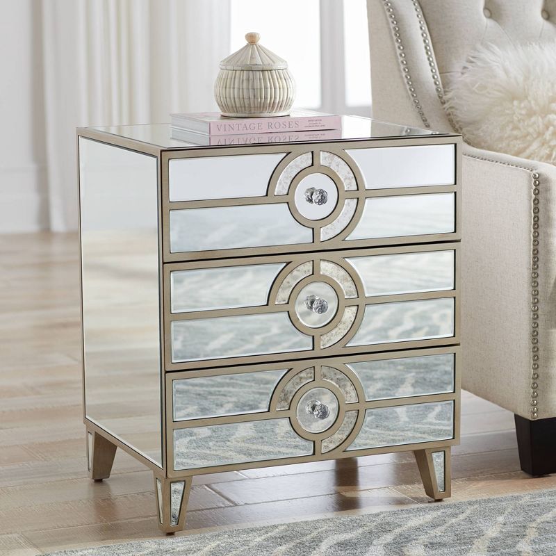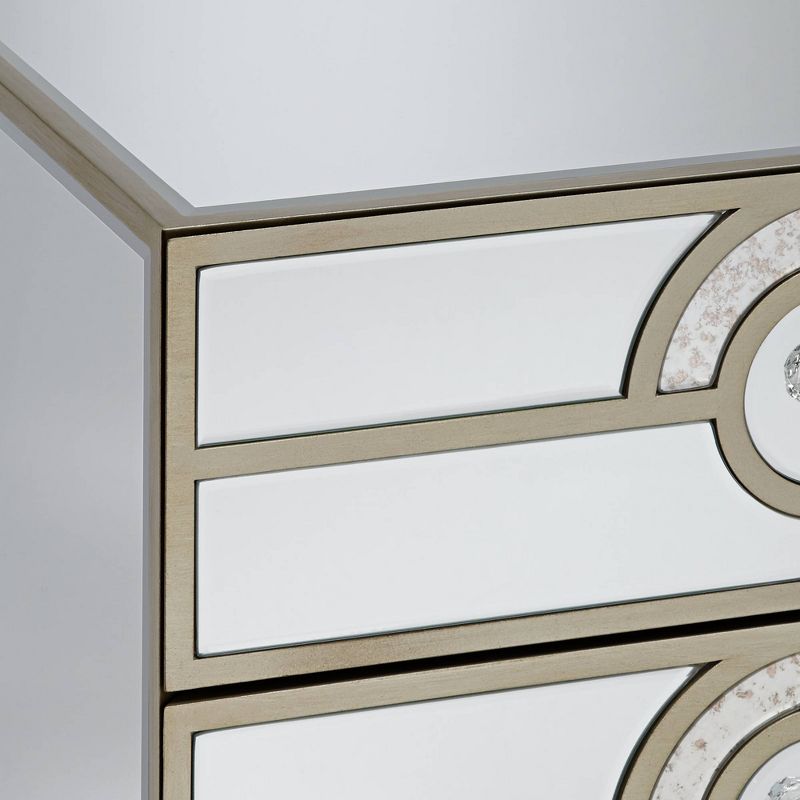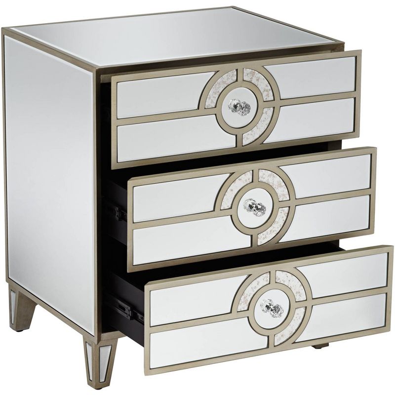 Combining style and craftsmanship, this art deco inspired mirrored side table has streamlined details that add to the overall appeal. Three drawers allow you to fit and store multiple items comfortably. The mirrored finish reflects more light and the champagne finish details add a lovely contrast.