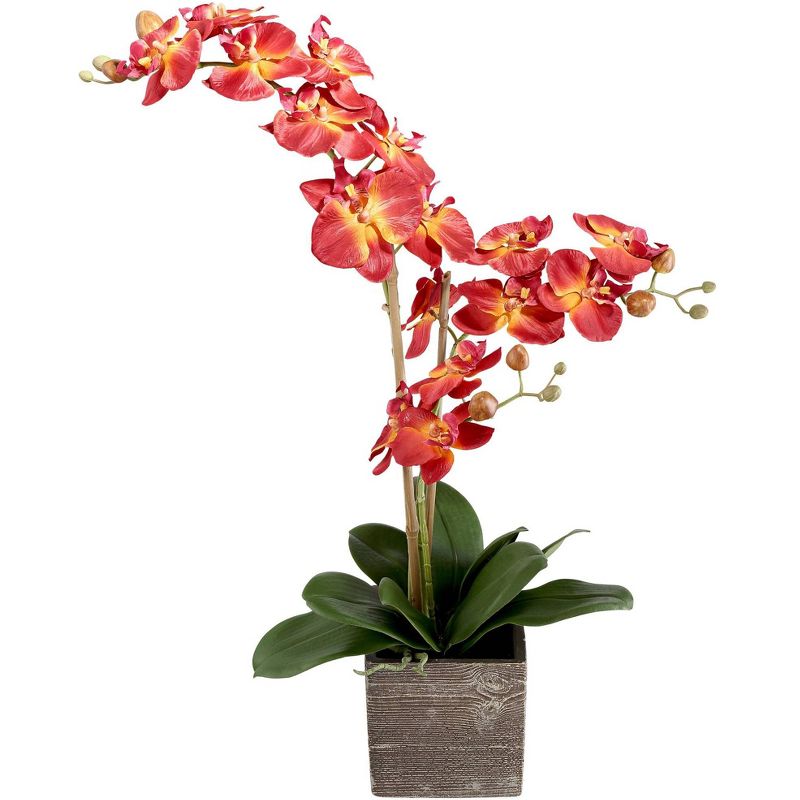Faux flowers offer low maintenance style making it the perfect centerpiece for your home. This polysilk look features the vibrant beauty of red orchids. Housed in a square faux wood container.