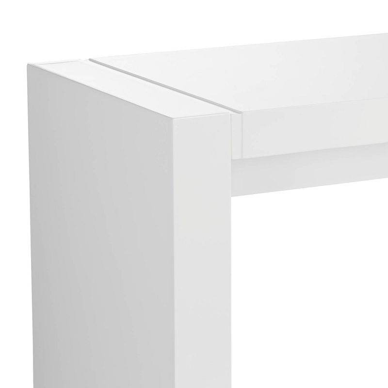 This contemporary style bar table offers a clean, minimalist look for dining areas and other rooms. The design comes in a crisp, high-gloss white finish. Open design means you can place storage units or ottomans underneath.