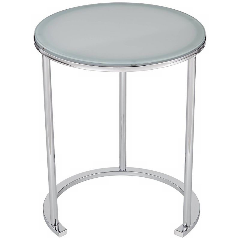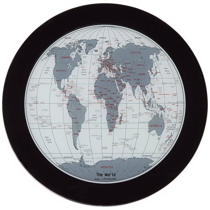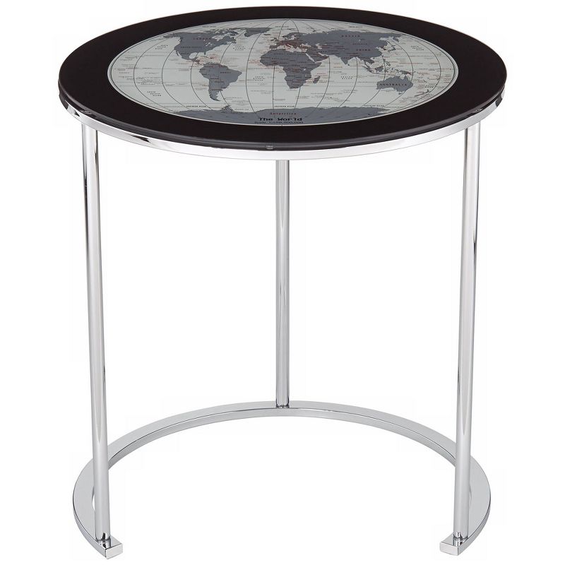 These contemporary accent tables offer a sleek and elegant update for your home. Each piece comes in a shining plated chrome finish open base, which supports a round glass top. The larger table features a world map design surrounded by a black border, while the smaller table is conveniently sized to fit underneath the other for easy storage.