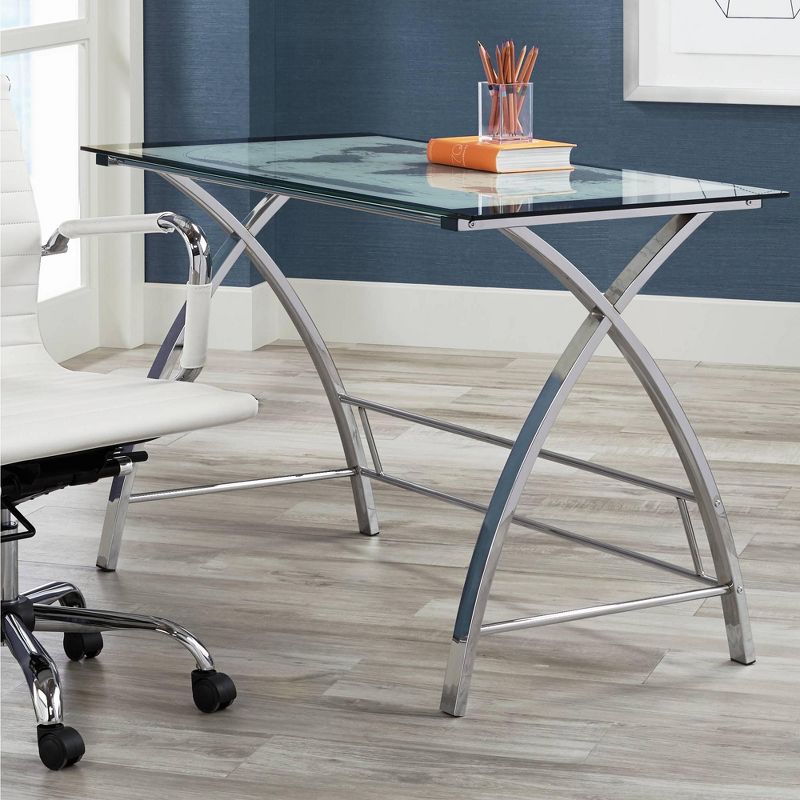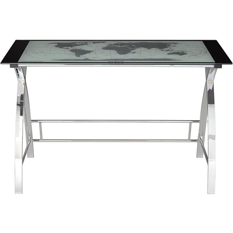 Crafted from strong chrome plated metal and durable tempered glass, this contemporary computer office desk offers plenty of surface space highlighted by a beautiful world map design. The base features a unique curved X pattern on the sides and a two-tier footrest in back.