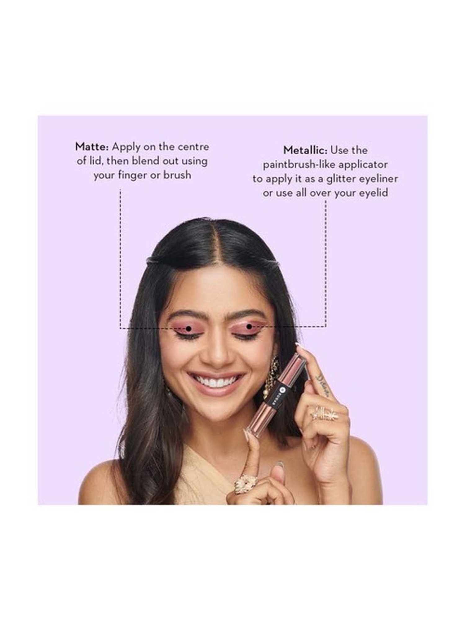 Matte: Apply product on the centre of your lid,blend the formula with a brush or finger to diffuse glitter particles Use as a glitter topper over the matte formula or over any powder shadowCreate a shimmery cut crease or highlight the inner corner of the eyes using the applicator,then blend out with finger or a brushUse it as a liner either by using the edge of the doe-foot or by picking up the product with an angular eyeshadow brushCan be used with powder eyeshadows layered on topMetallic: Use the paintbrush-like applicator to apply as a glitter eyeliner,or all over the lid to deliver optimal pigmentFor a beautiful shimmer effect |