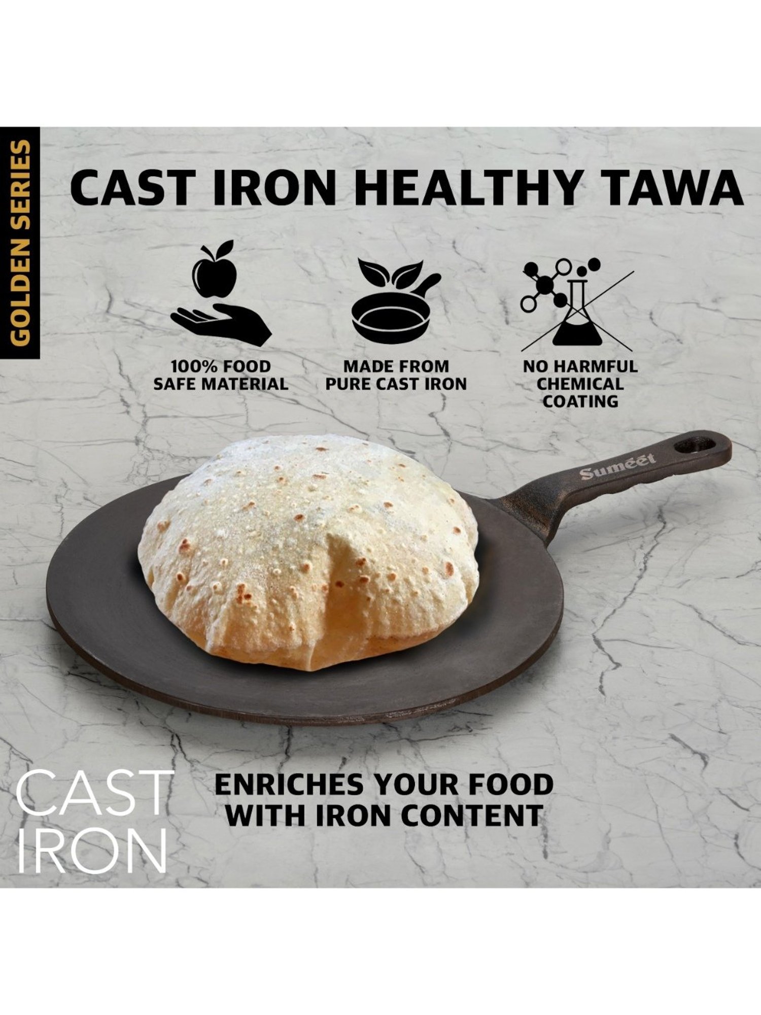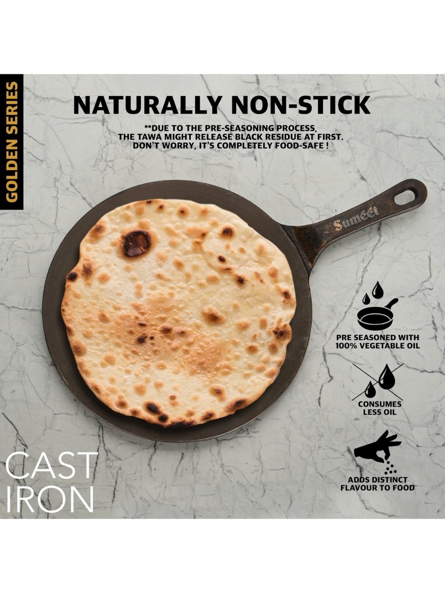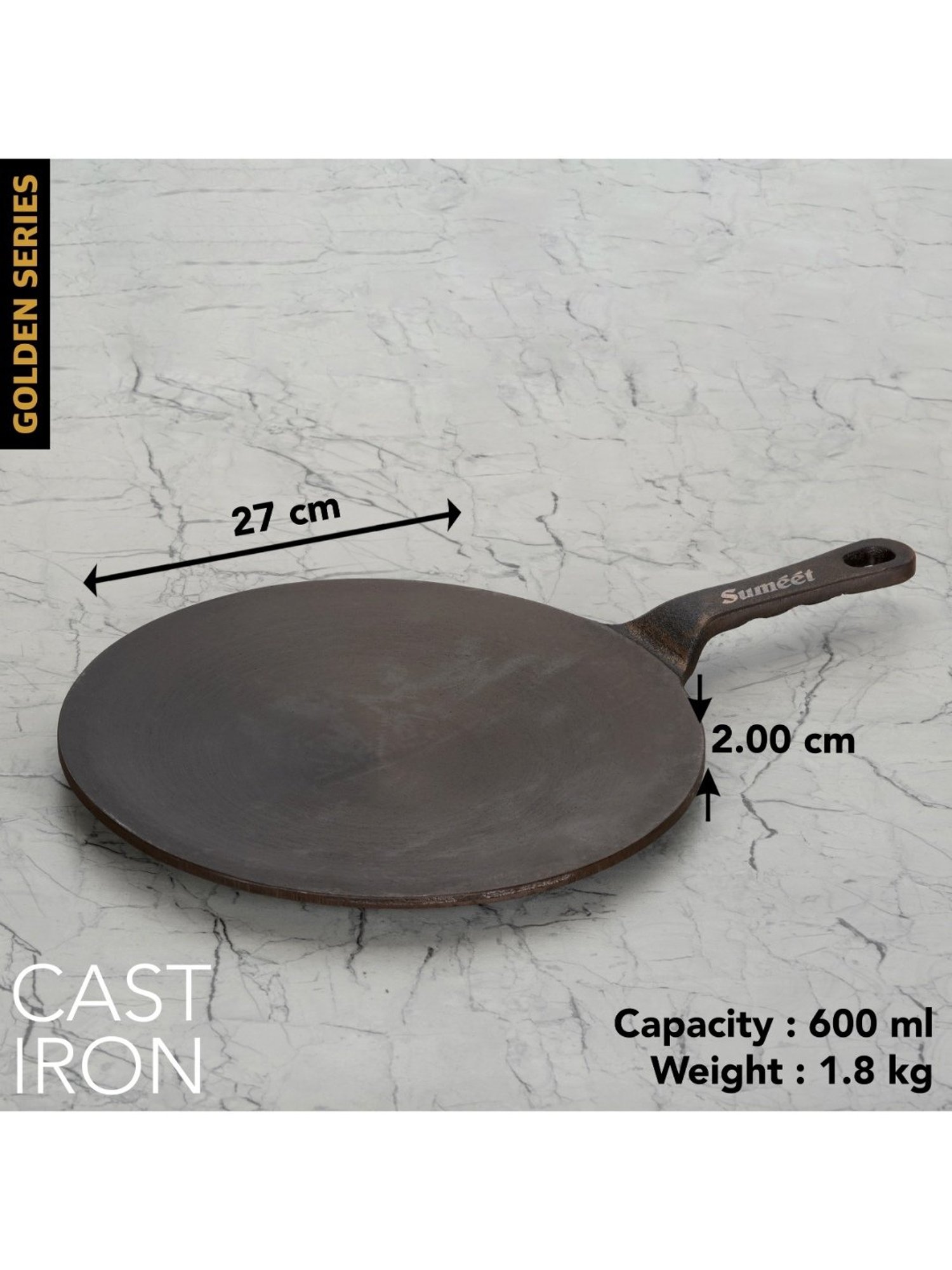 Sumeet presents Traditional Gold Cast Iron Concave Tawa with Modern look which enriches your food with iron. This tawa gives you healthy iron and keeps you away from iron deficiency. This tawa is Naturally Non-Stick, Coating free, Enamel free and Non-Toxic. Due to its pre-seasoning process with 100% vegetable oil, it consumes less oil and also adds distinct flavor to food. This tawa heats quickly and uniformly. This Tawa works not only on gas stove but also works on induction as well. Best part of this tawa is, it is one whole piece without any joints and screws.
