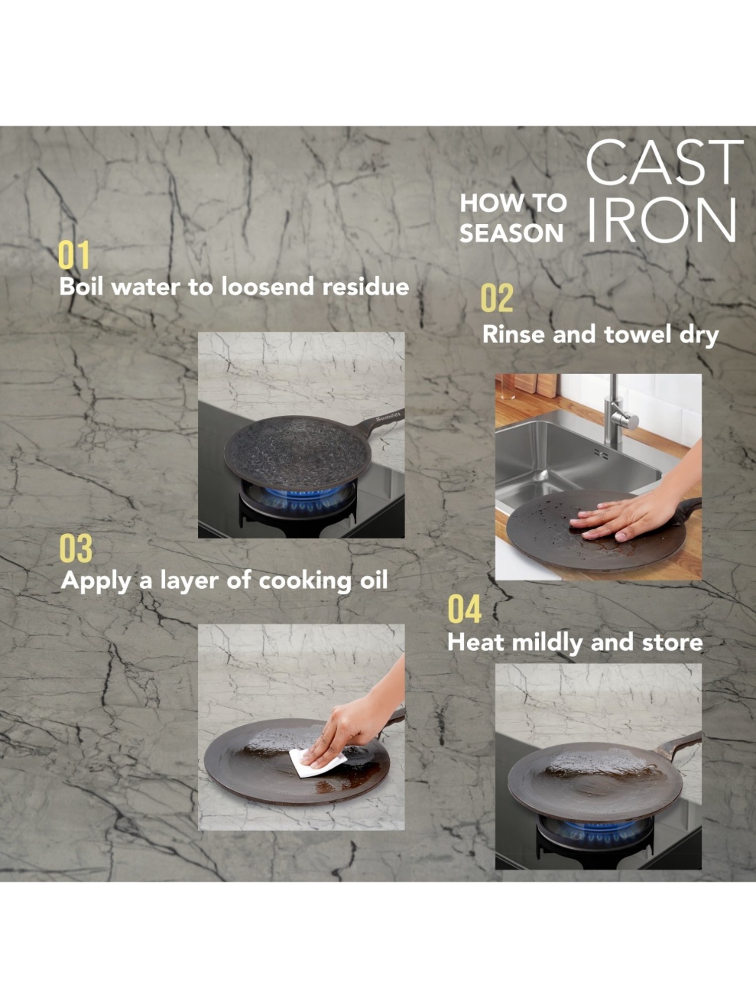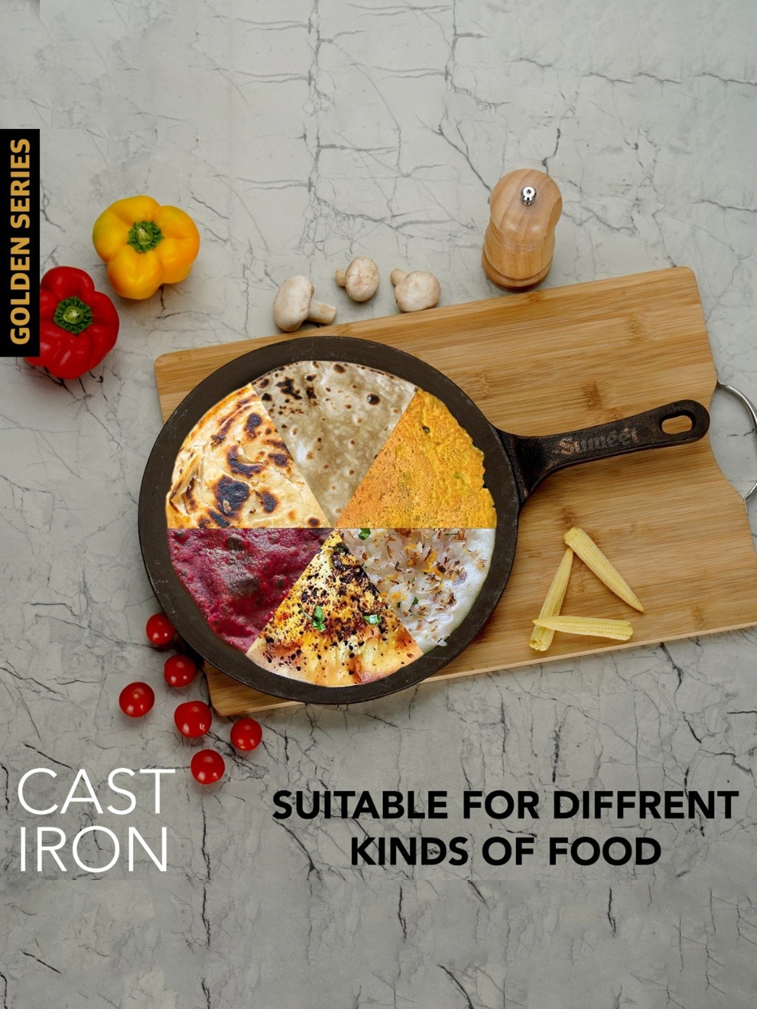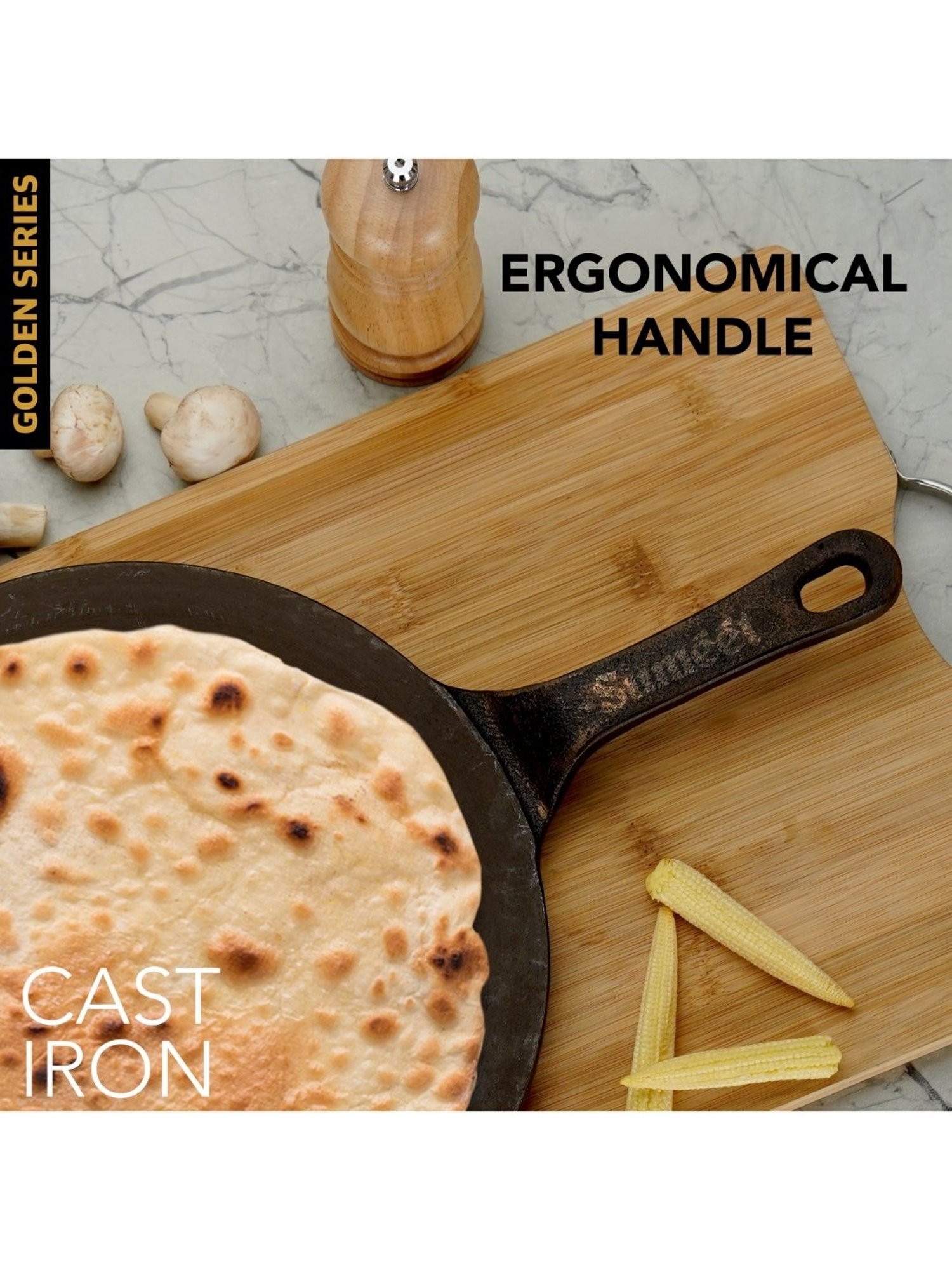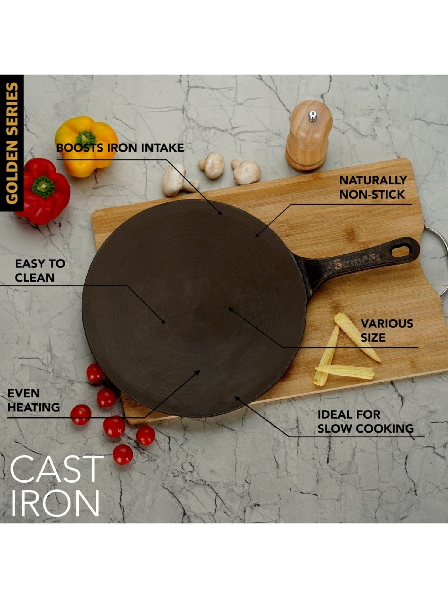 Sumeet presents Traditional Gold Cast Iron Concave Tawa with Modern look which enriches your food with iron. This tawa gives you healthy iron and keeps you away from iron deficiency. This tawa is Naturally Non-Stick, Coating free, Enamel free and Non-Toxic. Due to its pre-seasoning process with 100% vegetable oil, it consumes less oil and also adds distinct flavor to food. This tawa heats quickly and uniformly. This Tawa works not only on gas stove but also works on induction as well. Best part of this tawa is, it is one whole piece without any joints and screws.